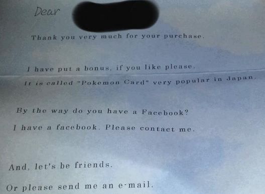ebayで日本人から商品を購入したところ、オマケとしてポケモンカードや「Facebookで友達になろう」という身の毛もよだつ手紙が添えられるという事案が発生しました。
