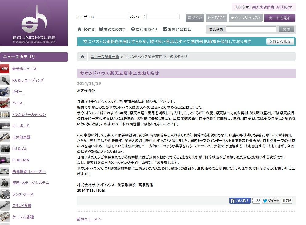 サウンドハウスは世話になってるし全面支持するわ。
