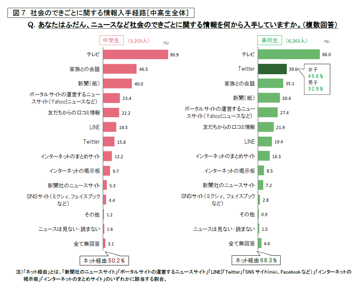 「ニュースなど社会のできごとに関する情報」の入手経路(複数回答)は、テレビが中学生で90.9%、高校生で86.0%と、ともに最多。中学生では、次いで家族との会話(46.5%)、新聞(40.0%)、ポータルサイトの運営するニュースサイト(23.4%)の順。高校生では、テレビの次にTwitter(39.6%)が入り、以下、家族との会話(35.1%)、新聞(30.4%)と続く。