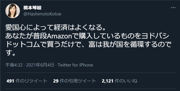 日本会議会員・橋本琴絵「お前らがAmazonでしている買い物をヨドバシカメラに変えるだけで日本の経済は良くなる。それが愛国心」 2021年06月07日 カテゴリ:VIP Tweet 29Comments 1: 名無し 2021/06/06(日) 22:09:28.11 ID:oMI1RojL0 橋本琴絵 @HashimotoKotoe 愛国心によって経済はよくなる。 あなたが普段Amazonで購入しているものをヨドバシドットコムで買うだけで、富は我が国を循環するのです。 続きを読む タグ :#通販#Amazon#ヨドバシ SDG's とかいう新興宗教wwwwwww 2021年06月06日 カテゴリ:VIP Tweet 29Comments 1: 名無し 2021/06/06(日) 18:26:20.90 ID:KBmZ68lDd0606 強烈な布教により着々と浸透している模様 2: 名無し 2021/06/06(日) 18:26:55.84 ID:KBmZ68lDd0606 子供から攻めてくの上手いよな 続きを読む タグ :#企業 クッソ素人がピザ自作する 2021年06月06日 カテゴリ:VIP Tweet 4Comments 1: 名無し 2021/06/06(日) 08:03:12.958 ID:lvIlSKLJ00606 小麦粉 続きを読む タグ :#食べ物#自作 Amazon、電子書籍読み放題「Kindle Unlimited 3ヶ月99円キャンペーン」を開始 2021年06月06日 カテゴリ:セール情報 Tweet 1Comments 615: 名無し 2021/06/04(金) 05:34:33.85 ID:AOKRDDgx 今回プライムデー開催記念なのかな? 99円美味しいです https://www.amazon.co.jp/kindle-dbs/hz/subscribe/ku/ 続きを読む タグ :#電子書籍#Amazon#Kindle Apple社員「嫌だ!会社行きたくない!リモートワークが良いの😭」 2021年06月06日 カテゴリ:ニュース Tweet 2Comments 1: 名無し 2021/06/06(日) 11:52:33.14 ID:wmHoH5+a00606 米アップルの一部従業員グループ、9月からの週3日出社に反対。柔軟な対応望む https://japanese.engadget.com/apple-employee-group-refuses-to-return-to-office-205054467.html 続きを読む タグ :#Apple エアコン買ったから見てくれ 2021年06月06日 カテゴリ:VIP Tweet 4Comments 1: 名無し 2021/06/05(土) 20:58:02.36 ID:qc3r3HXZ0 富士通や 続きを読む タグ :#家電#買った |<<前のページ...2627282930...次のページ>>|