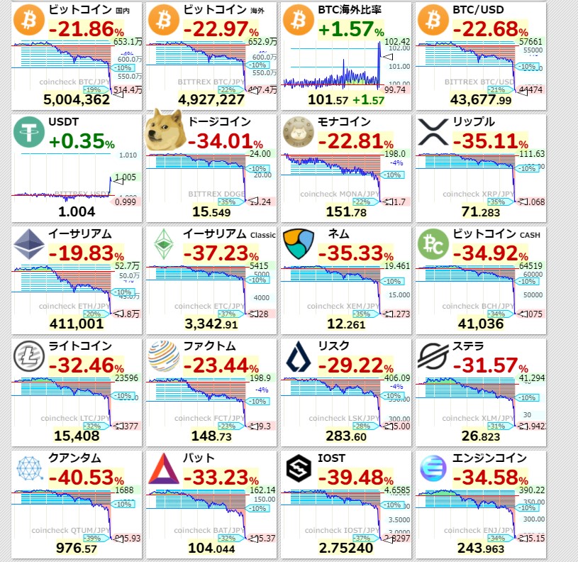 【悲報】仮想通貨の価格が急落 ビットコインは一時500万割れ