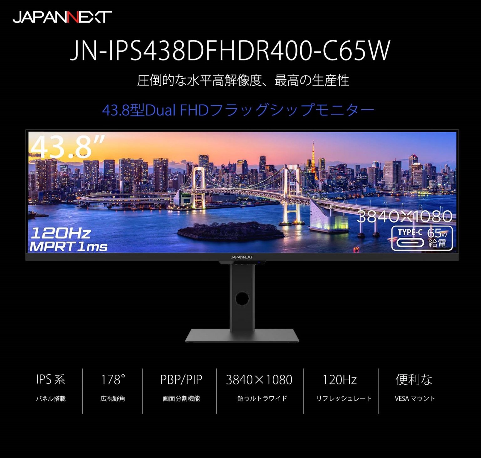 JAPANNEXT、3840×1080解像度の43.8インチモニタ「JN-IPS438DFHDR400-C65W」を発売
