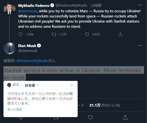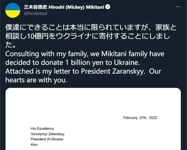 三木谷浩史 Hiroshi (Mickey) Mikitani @hmikitani (2022/02/27 01:28:08) 僕達にできることは本当に限られていますが、家族と相談し10億円をウクライナに寄付することにしました。 Consulting with my family, we Mikitani family have decided to donate 1 billion yen to Ukraine. Attached is my letter to President Zaranskyy. Our hearts are with you. https://twitter.com/hmikitani/status/1497609434721251330