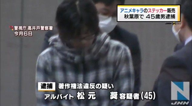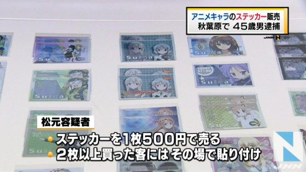 東京・秋葉原で、無断で作成された「涼宮ハルヒの憂鬱」など人気アニメのステッカーなどを販売する目的で所持していたとして、45歳の男が逮捕されました。