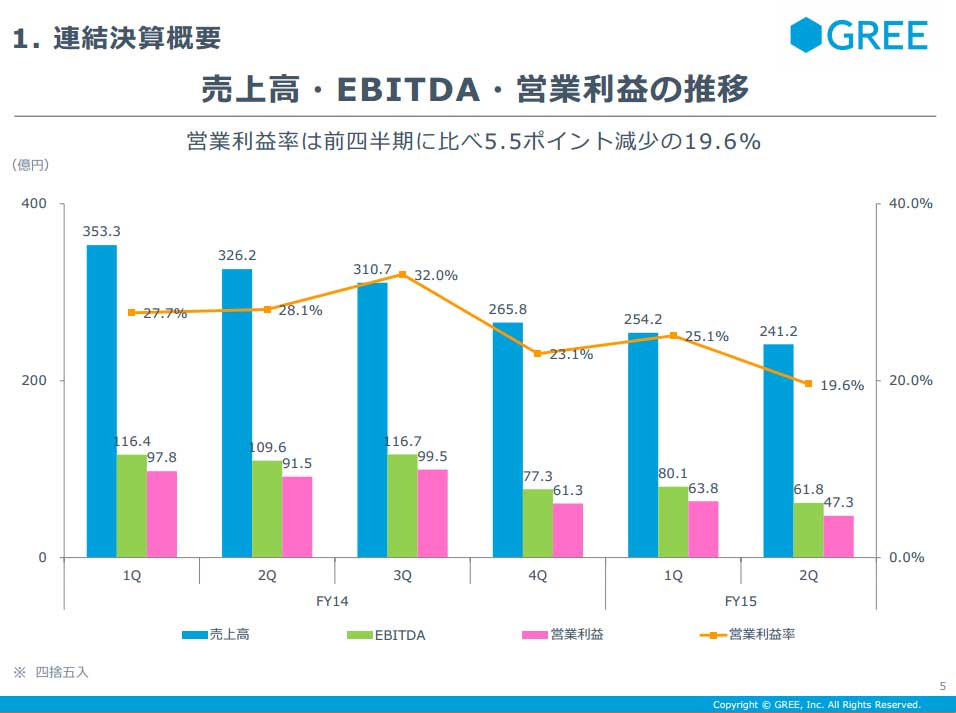 グリーは2月4日、2015年6月期通期の連結業績予想を公表した。営業利益は前期から42.9%減の200億円、 最終損益はゼロ(前期は173億円の黒字)と大幅な減益になる見通しだ。「国内外のネイティブゲームの新たなヒットタイトル創出に時間を要することが主因」としている。