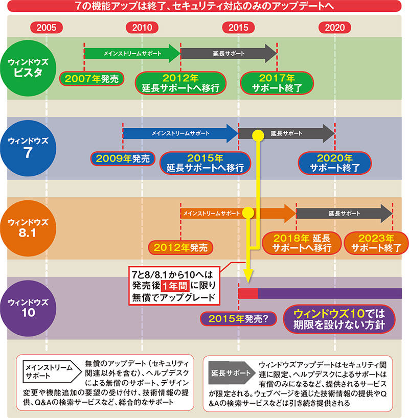 注意したいのは8.1にアップグレードしていない8ユーザー。図1のスケジュールは、各OSの最新版(サービスパック含む)の場合なので、現状では8.1が対象となる。最新版でないOSは、次のサービスパック(この場合は8.1)が公開されてから2年間でサポートが終了するのが原則。これに照らし合わせると、2015年10月に8のサポートは終了してしまう。