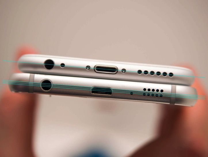 続いてよく似ていると言われていた「iPhone 6」と「Galaxy S6」の底面を比較した写真で両モデルを比較してみよう。上にある「iPhone 6」は全ての要素が綺麗に揃っているのに対し、「Galaxy S6」は見ての通りガタガタ。