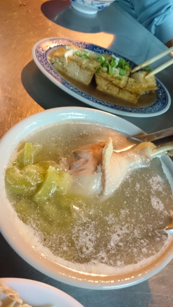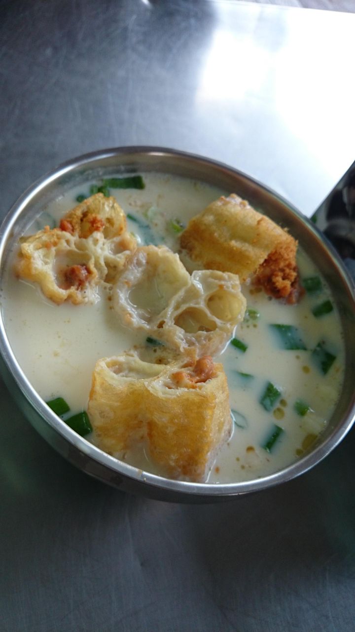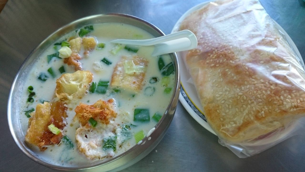 温かい豆乳に揚げパンと肉ふりかけ、あと漬け物のようなものが入った台湾ではポピュラーな朝ごはん