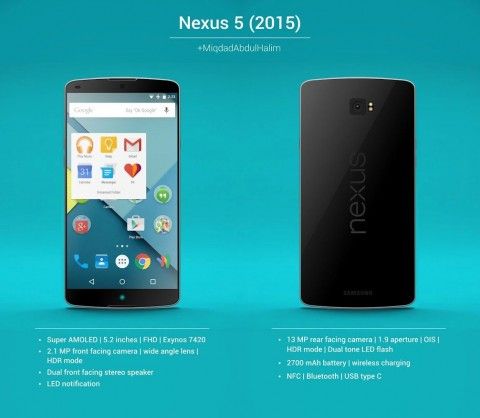 LG製のNexus 5(2015)は、5.2インチ WQHDディスプレイ、Snapdragon 808、RAM 3GB、背面に1300万画素カメラ(光学式手ぶれ補正)、指紋認証リーダー、レーザーAF、USB Type-C、Android 6.0を搭載していると伝えられています。