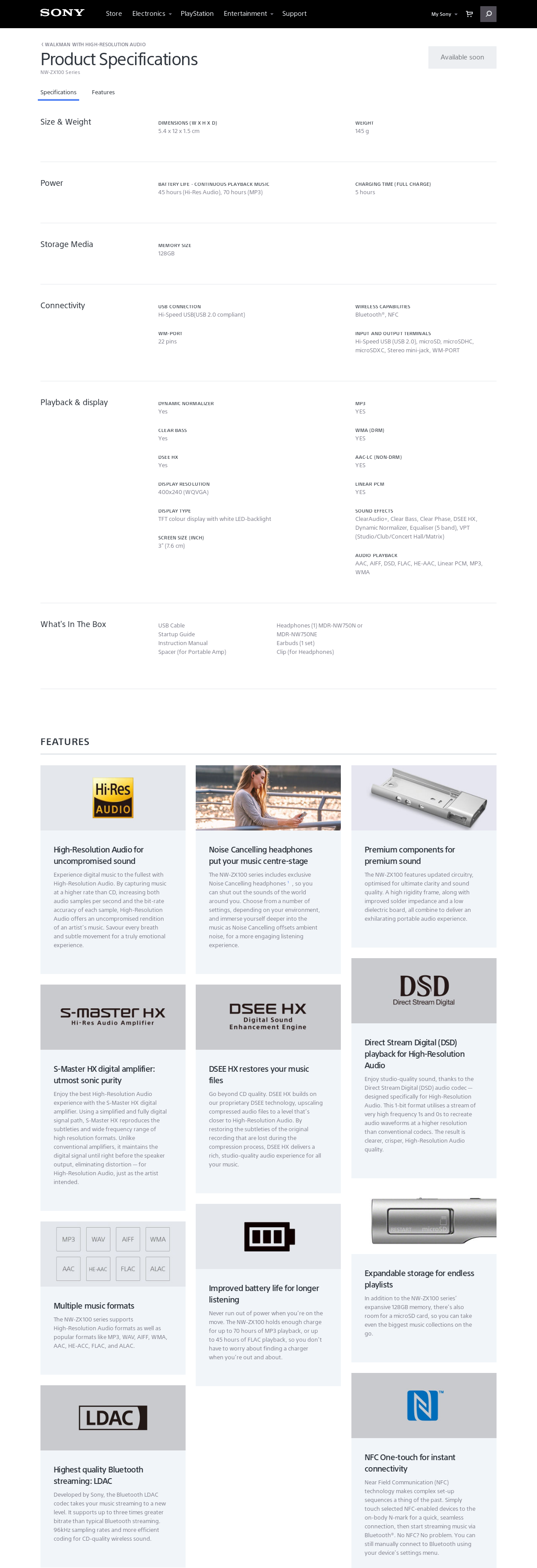 ZX100は、3インチ(400 × 240)の液晶ディスプレイ、ストレージ128GB(MicroSDカードスロット搭載)、45時間駆動バッテリーを搭載。S-Master HX / DSEE HX / Clear Audio+ / Clear Bass / Equalizer / VPT / Dynamic Normalizerに対応。筐体サイズは119.5 x 53.8 x 14.8mm、質量は145g。