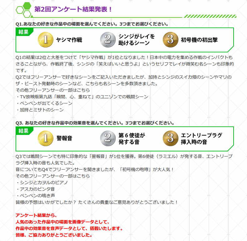 このエヴァンゲリオンスマートフォンの企画は7月13日に始動。3万人のサポーターを募集し、ファンの意見を取り入れながら進められていました。これまでのアンケート調査で、裏フタ部分のデザインは「初号機」が一番人気。裏フタのデザインの方向性は「シンプル」で、スマホに入れて欲しいキャラクターボイスは「アスカ」が一番人気でした。アンケート結果は公式サイトに掲載されています。