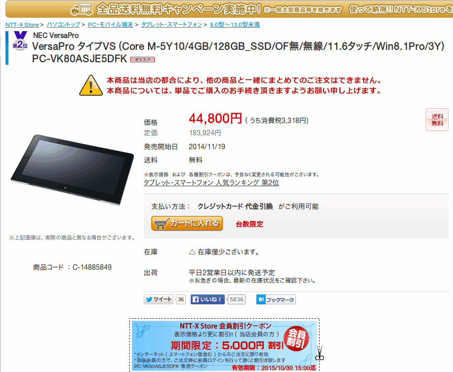 VersaPro タイプVS (Core M-5Y10/4GB/128GB_SSD/OF無/無線/11.6タッチ/Win8.1Pro/3Y) PC-VK80ASJE5DFK