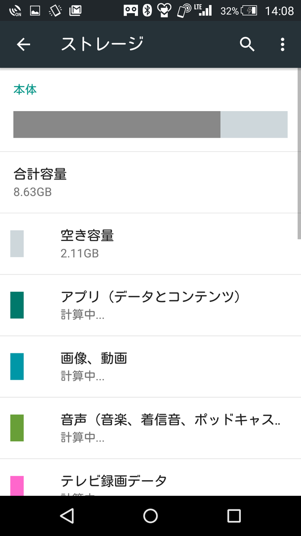 SH-02Hに必要なアプリを放り込んだ状態の残りストレージ。やっぱり、ギリギリだなぁ(^^;