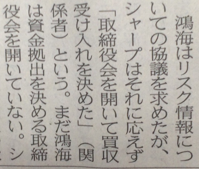 取締役会で議題にするかどうかは「両社の協議の進展次第」だと強調、関連情報は鴻海の発表を基準にしてほしいと求めた。証取によると、鴻海が30日の取締役会でシャープ買収を議題にする場合、30日の鴻海株取引を一時停止する申請を前日の29日に行う必要がある。