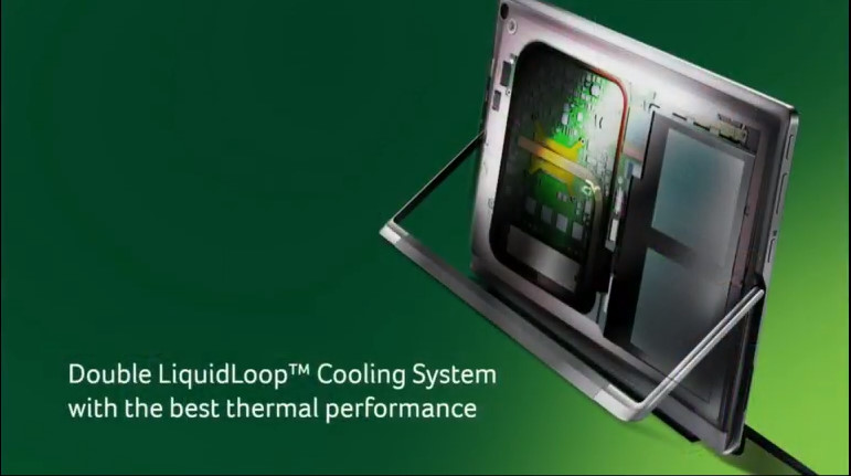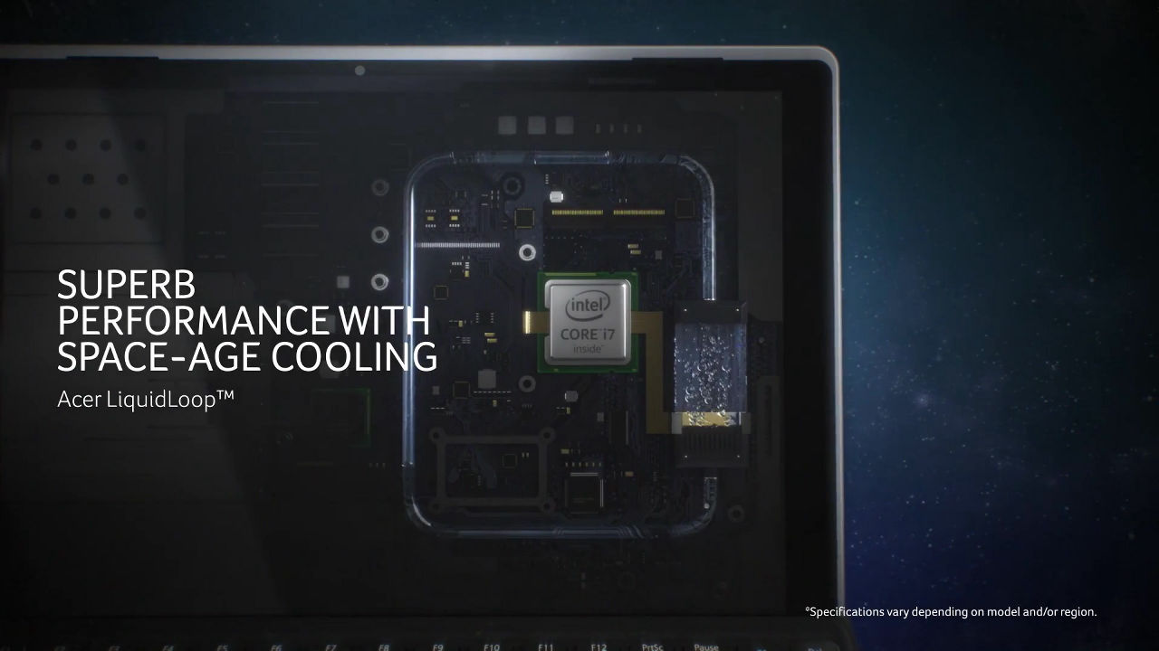 第6世代のCore i プロセッサをファンレスで動かすために、Acer独自の水冷システム「Double Acer LiquidLoop」を採用しているとのこと。