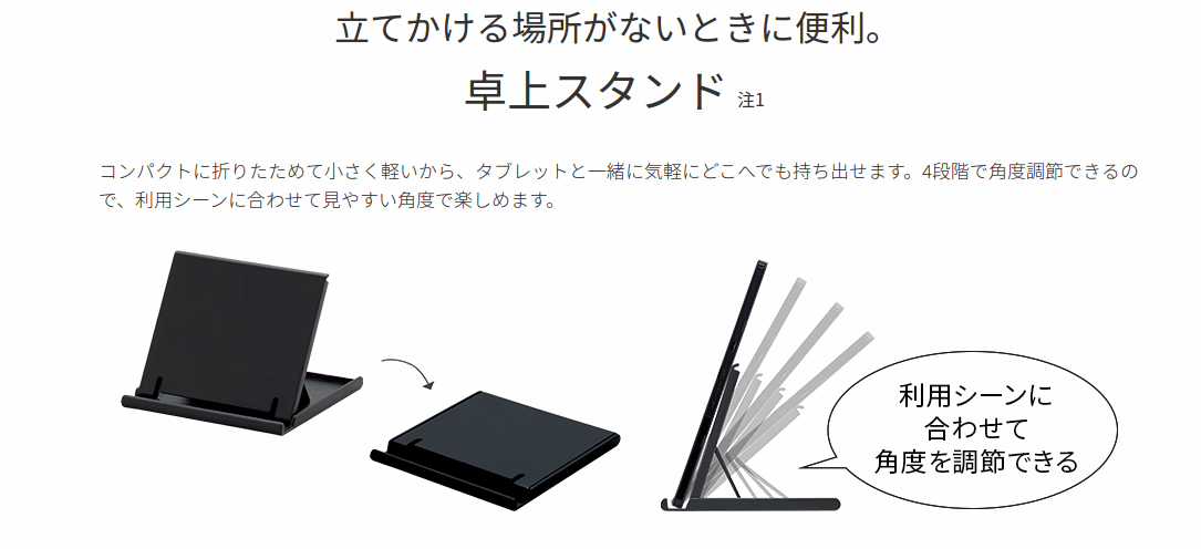 筐体にはすべり止めグリップが搭載されており、立て掛けた際にすべりにくくなっているとのこと。また、立て掛ける場所がない時に使える卓上スタンドも同梱。