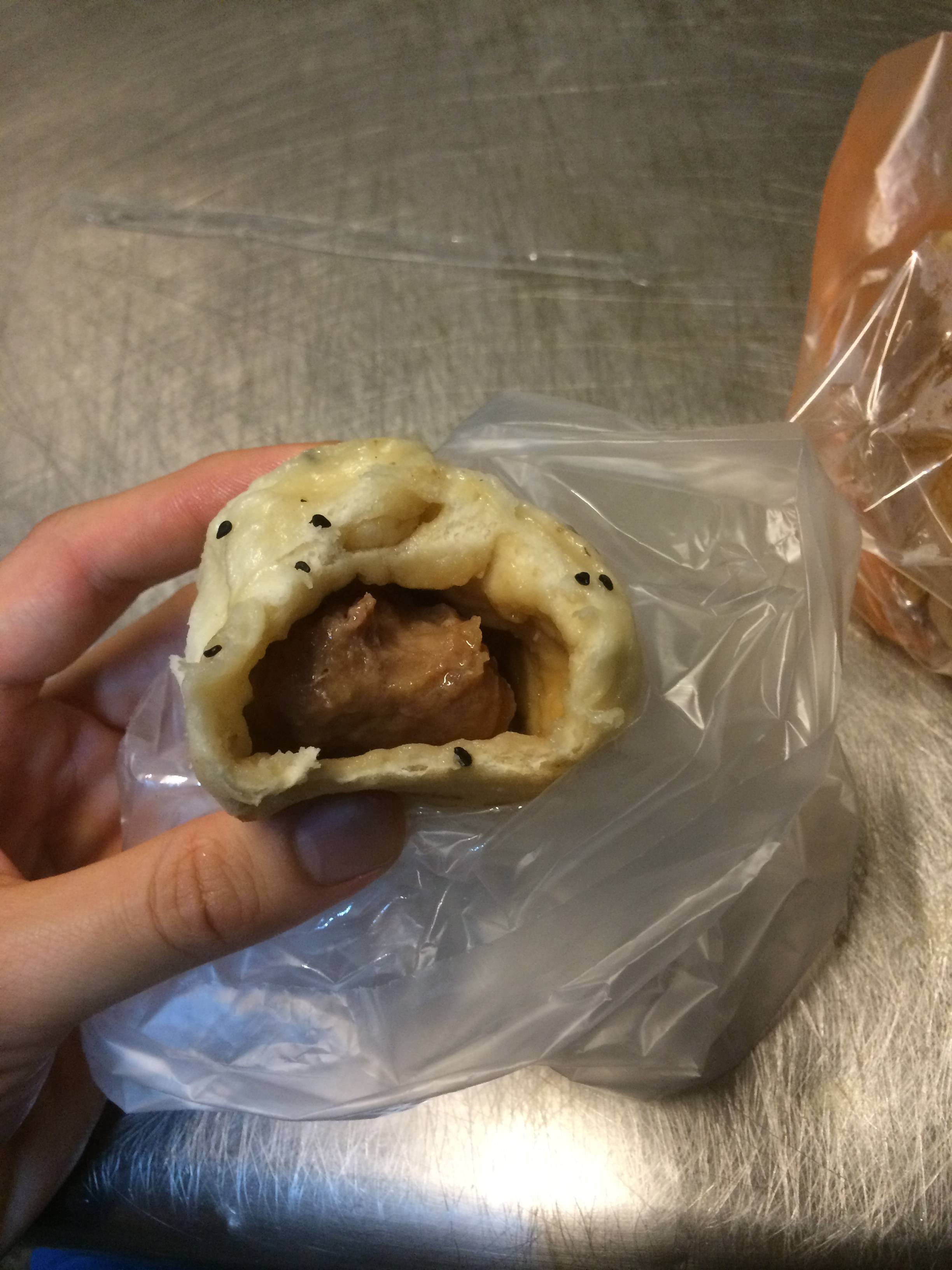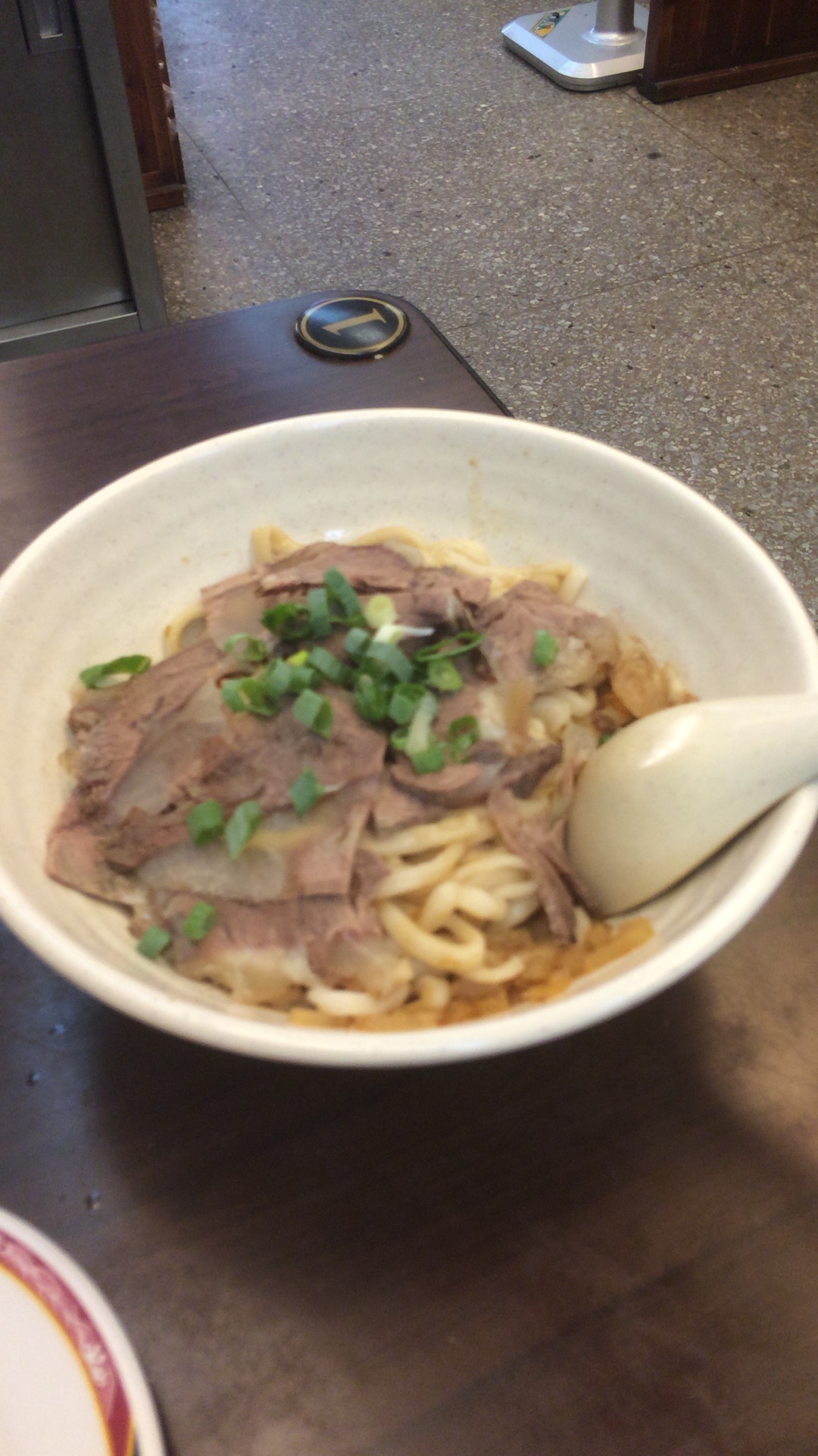 んで遅めの昼飯。汁なし牛肉麺と中華まん
