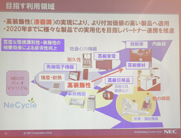 NECらが今回開発したバイオプラスチックは、ワラや木などの非食用植物を原料としたセルロース樹脂を使用。古くから海外から高く評価されてきた日本伝統の漆ブラックをバイオプラスチックで再現し、装飾性を高めることでより付加価値の高い製品への適用を目指した。 (略)
