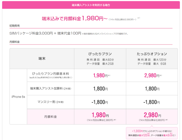 UQもYモバも月額1980円だからこれは安いね