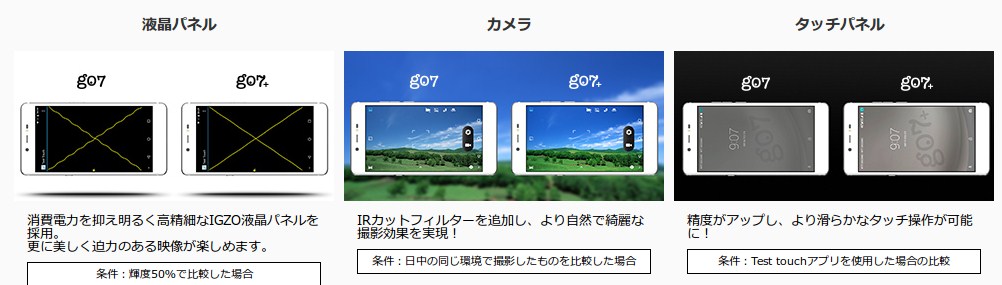 「g07+」は、SIMロックフリーのAndroidスマートフォン「g07」を強化したモデルです。2枚のSIMカードでLTE+3Gで対応できる「DSDS」をサポートし、新たにau 3G(CDMA2000)方式もサポートしています。