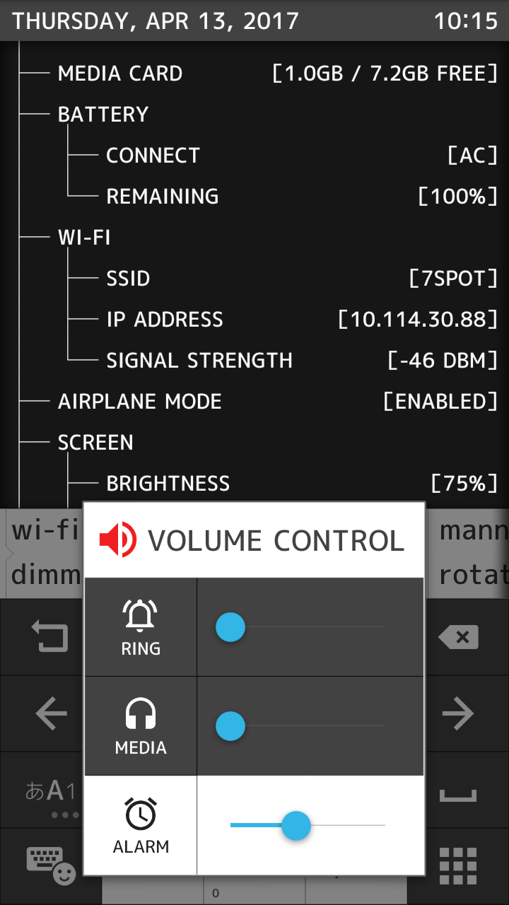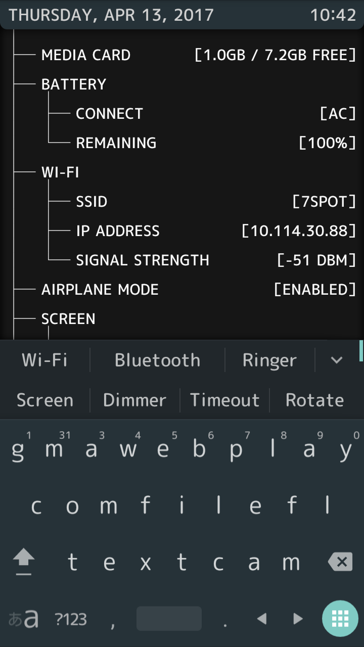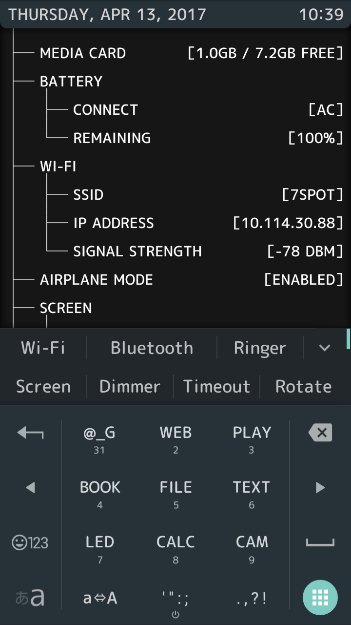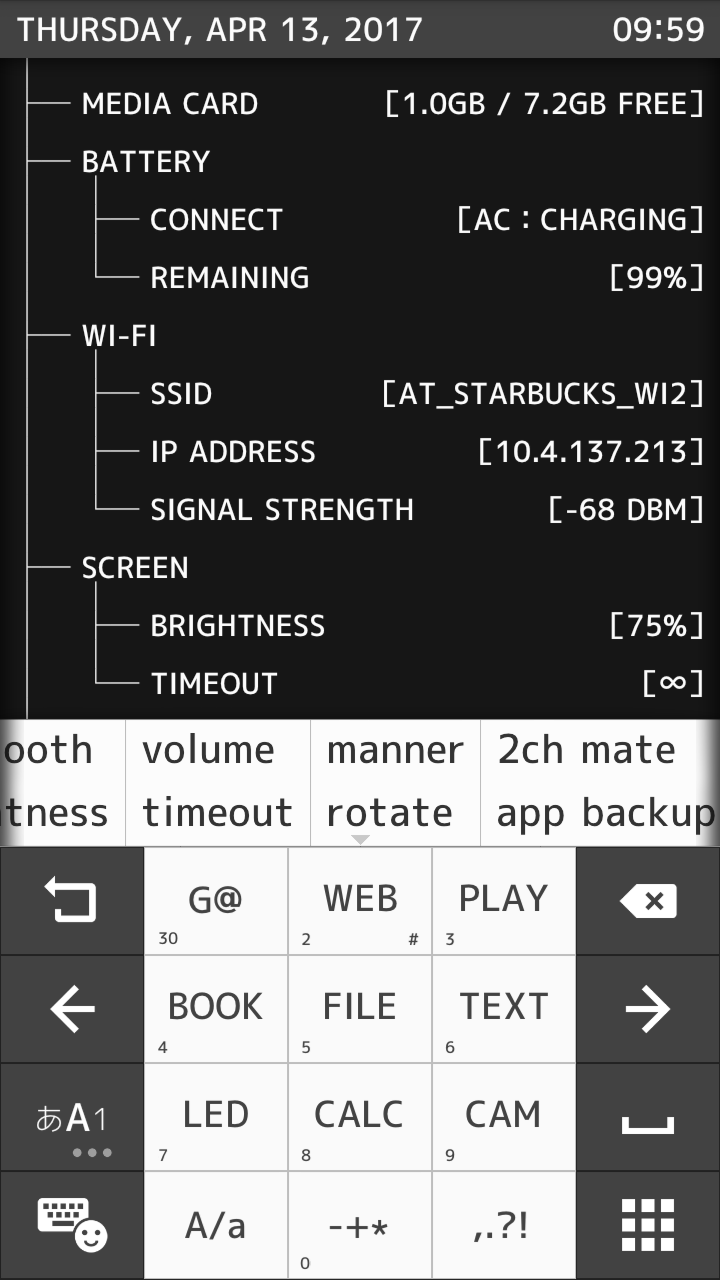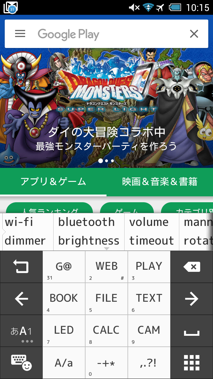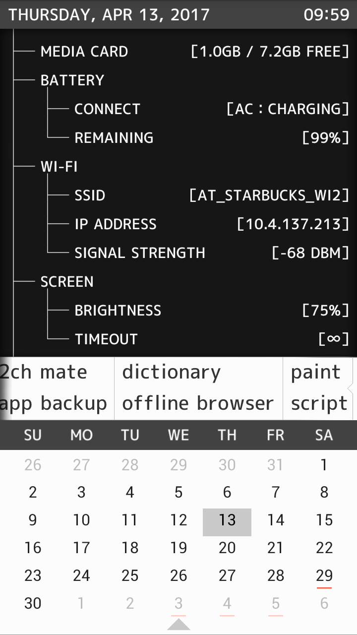 画面をタップすると、下からキーボードっぽいものが生えてきます。キーボードの上の二列は横にスクロールします。キーボードを↓すると、ズルズル下がってカレンダーが現れます。