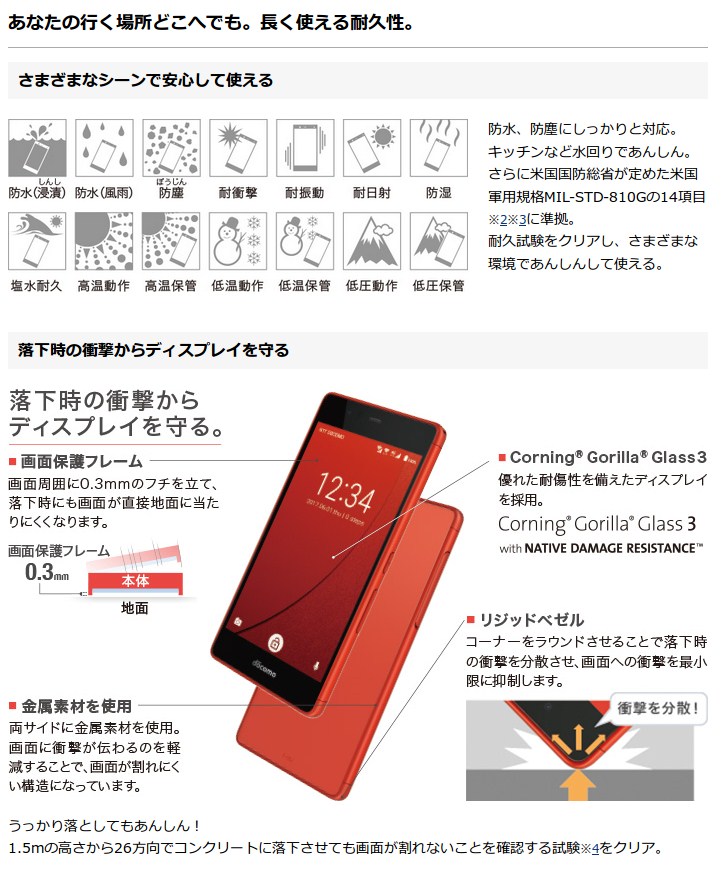 - その他:ワンセグ、おサイフケータイ、IP68の防塵・防水&耐衝撃など(MILスペック)