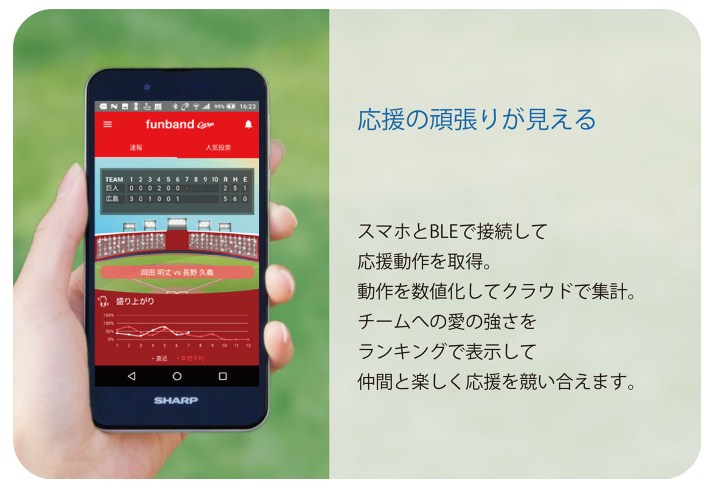 スマホとBLEで接続して応援動作を取得。動作を数値化してクラウドで集計。チームへの愛の強さをランキングで表示して仲間と楽しく応援を競い合えます。