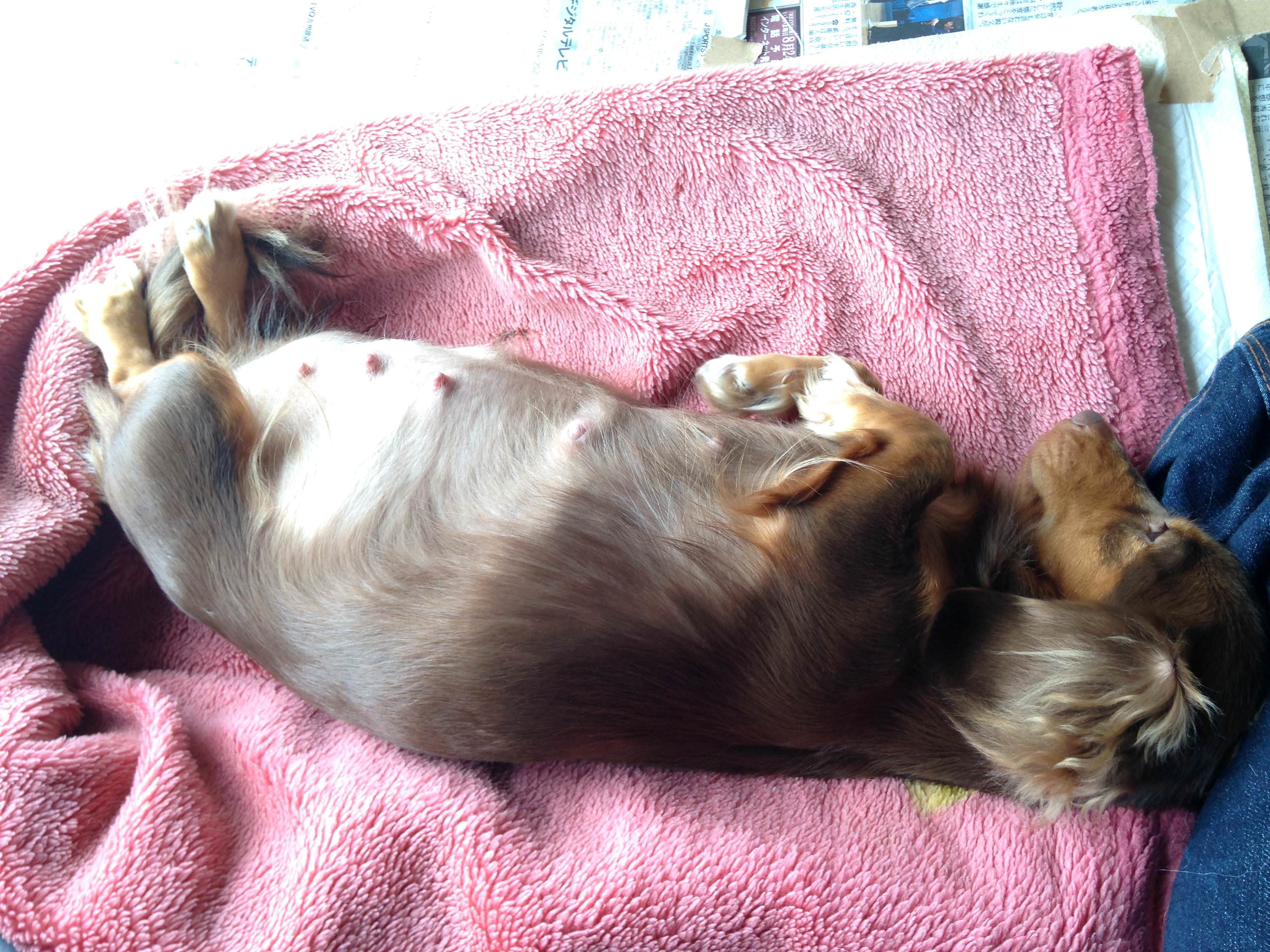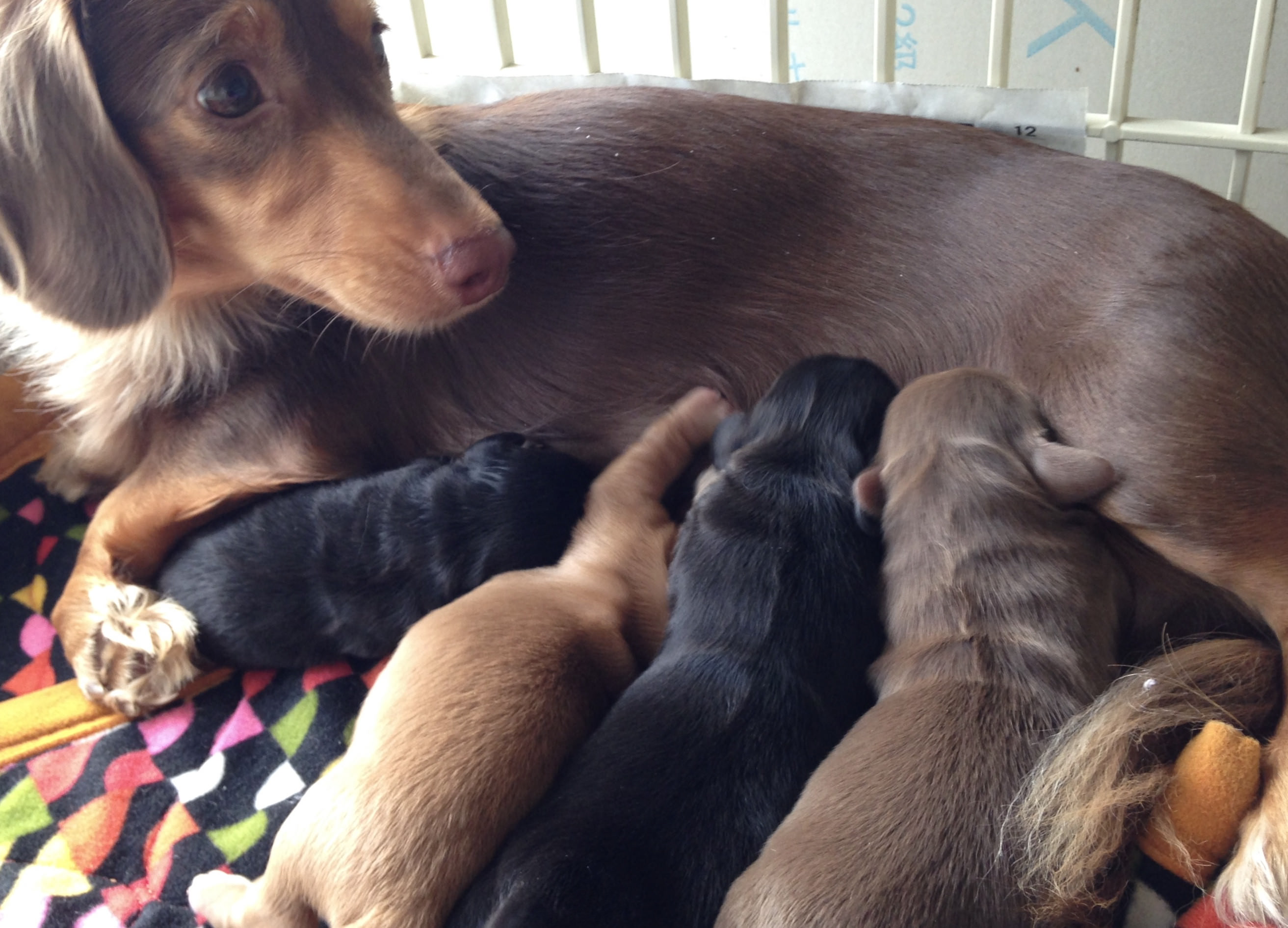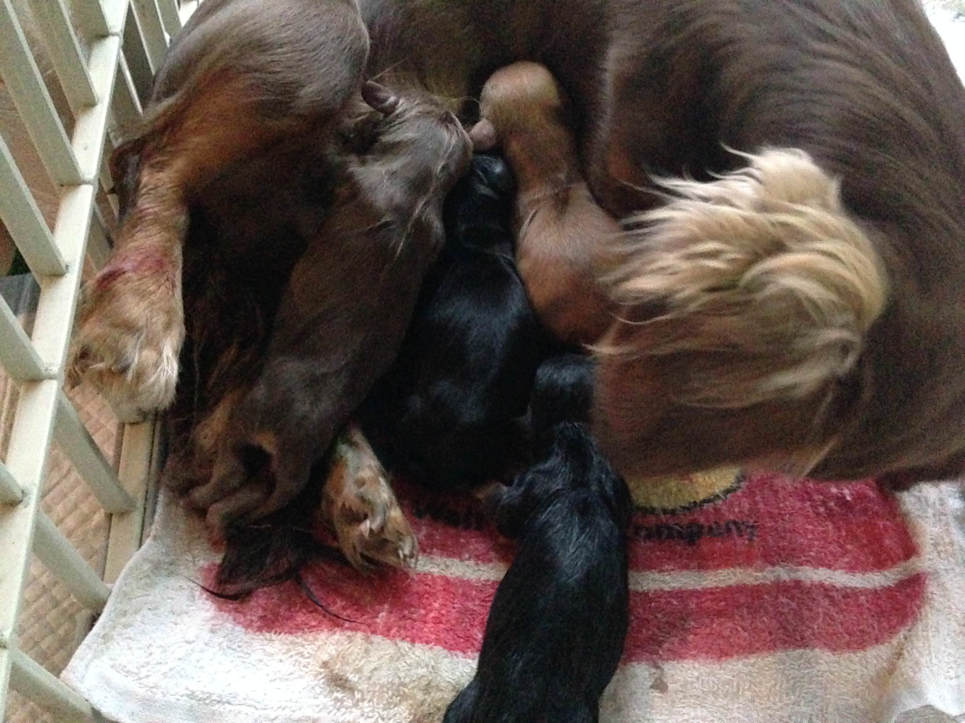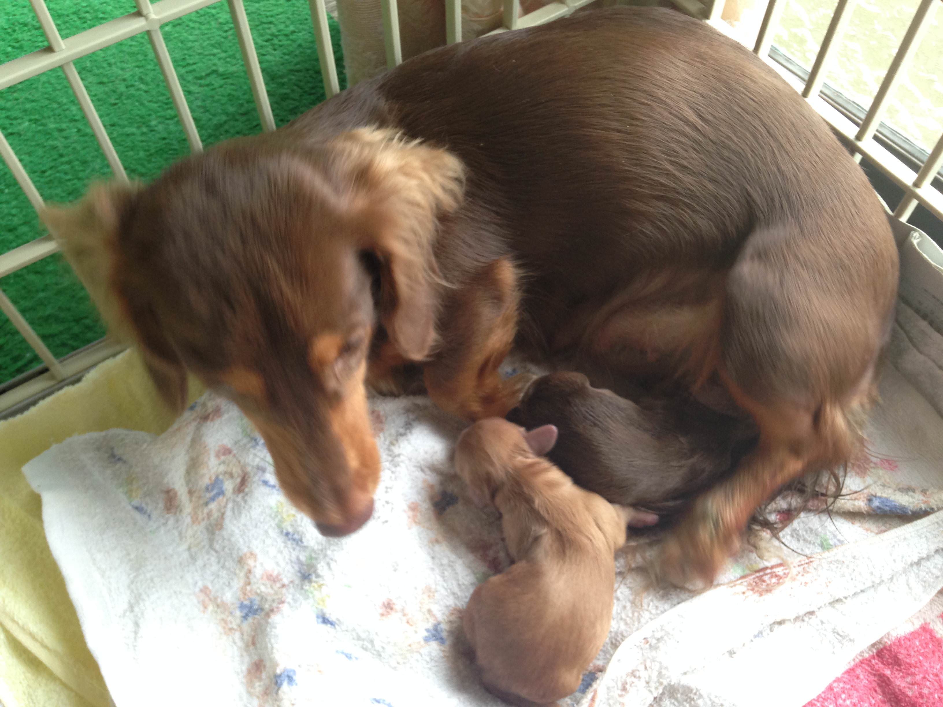 産まれて来てるのに、子犬たちをお腹で守りながら