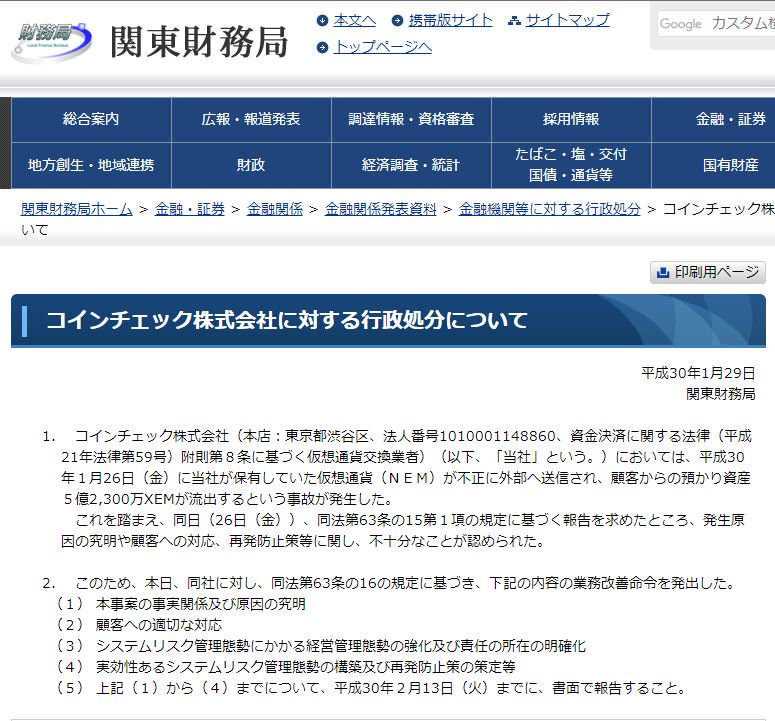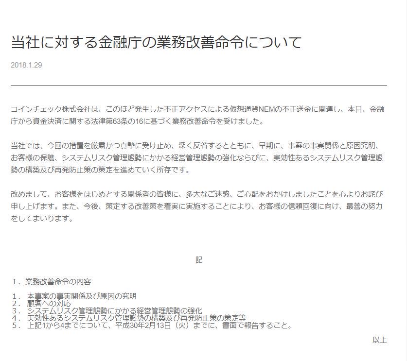 コインチェックは流出した仮想通貨NEMの保有者に対する補償を現金で行う方針を示しているが、同庁は「顧客に返せるとしている返済原資は確認中」としており、返済実施の具体的なスケジュールについても報告を受けていないとしている。