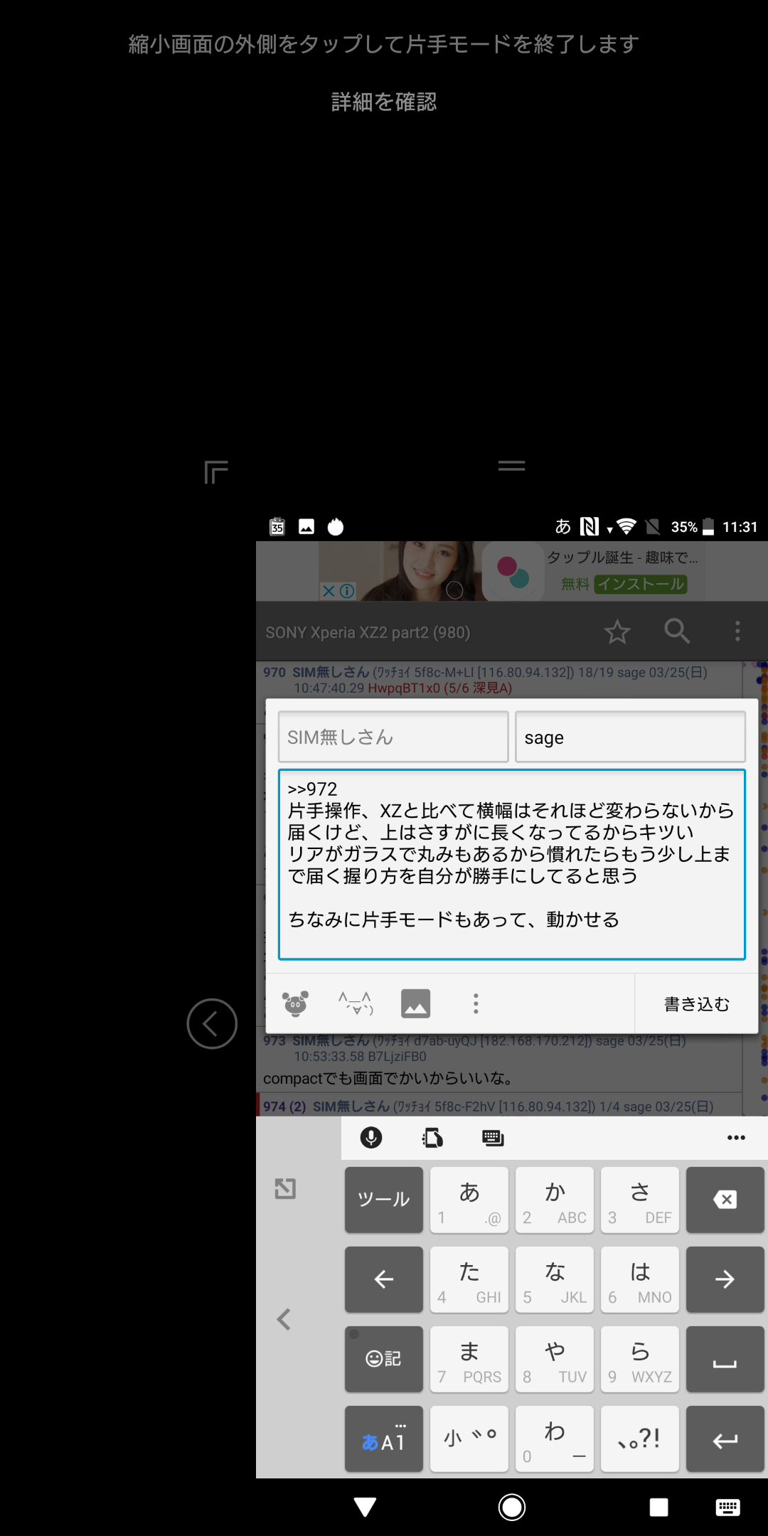 画面外の黒いところタップか、ホームボタンタップで元のサイズに戻る