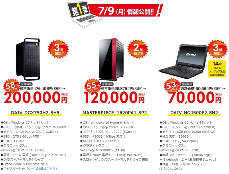 おもな仕様は、Core i9-7900X、メモリ64GB、2TB SSD、4TB HDD×2、GPUにGeForce GTX 1080 Ti、DVDスーパーマルチドライブ、OSにWindows 10 Pro、Office Home & Business 2016などを搭載し、通常価格は476,496円だが、58%オフの20万円で販売される。