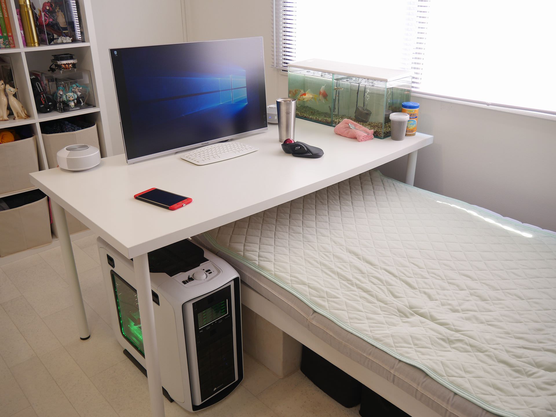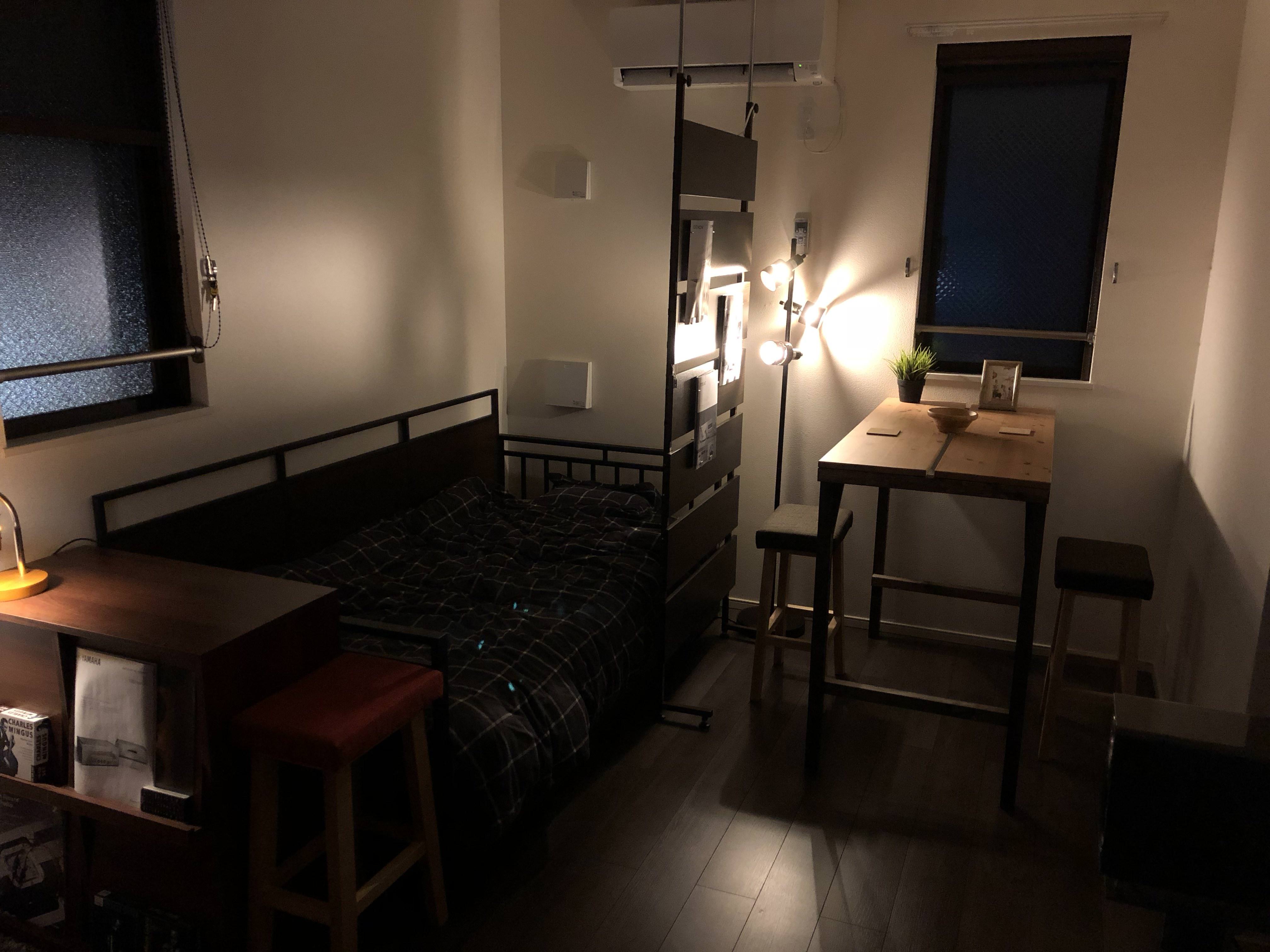 テーブルはパソコンのデスクがお値段以上のとこで2万円、ベッド側のハイテーブルは自作です。