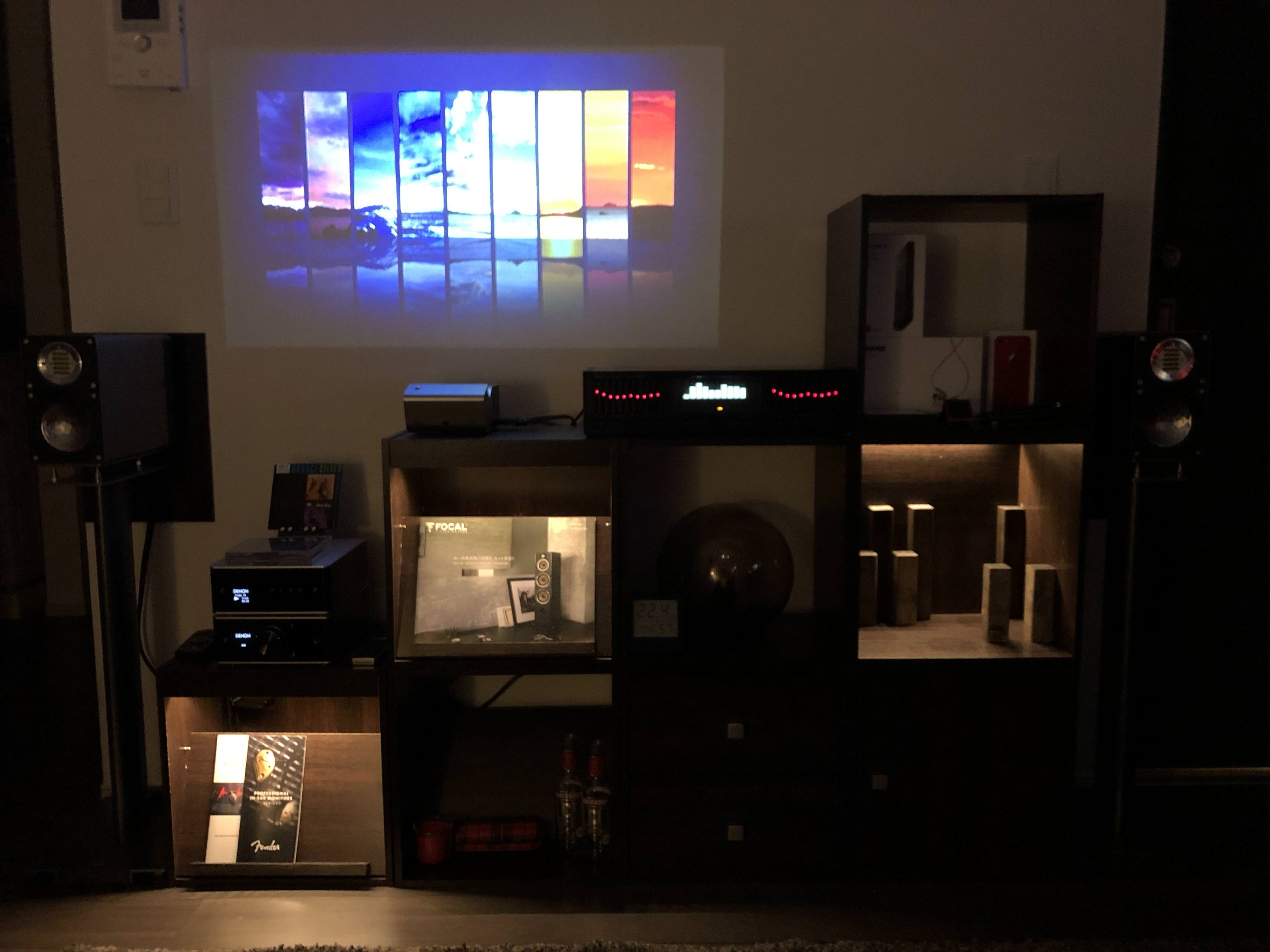 黒とシルバーの2段になってるのがCDプレイヤーとプリメインアンプ。ソースはCDだったりBluetoothだったりプロジェクターからAUXだったり... あとたまにイコライザーかまして遊んでます