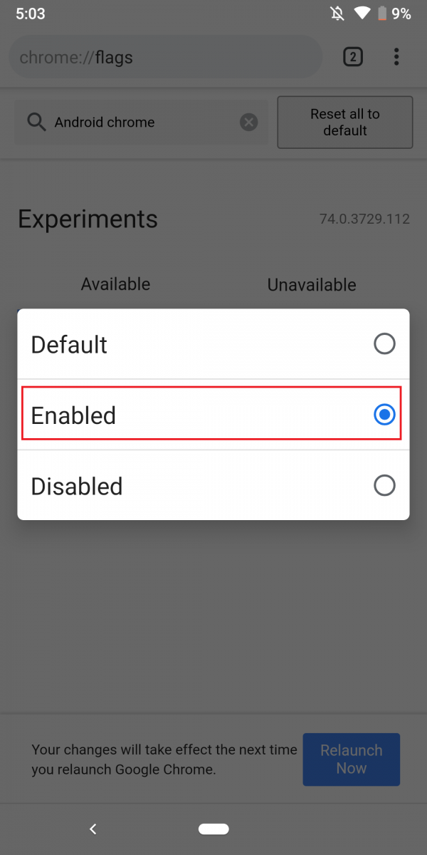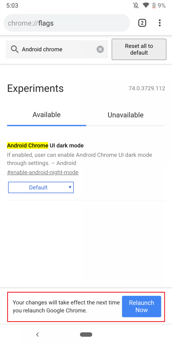 ④Chromeの再起動が求められるのでRelaunch Nowをタップして再起動