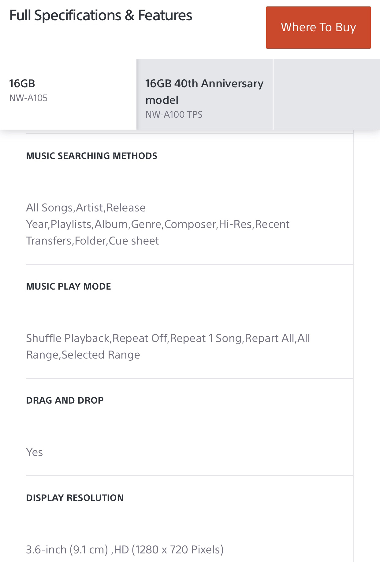 - 型番:16GBモデルがNW-A105、16GB 40周年記念モデルがNW-100TPS