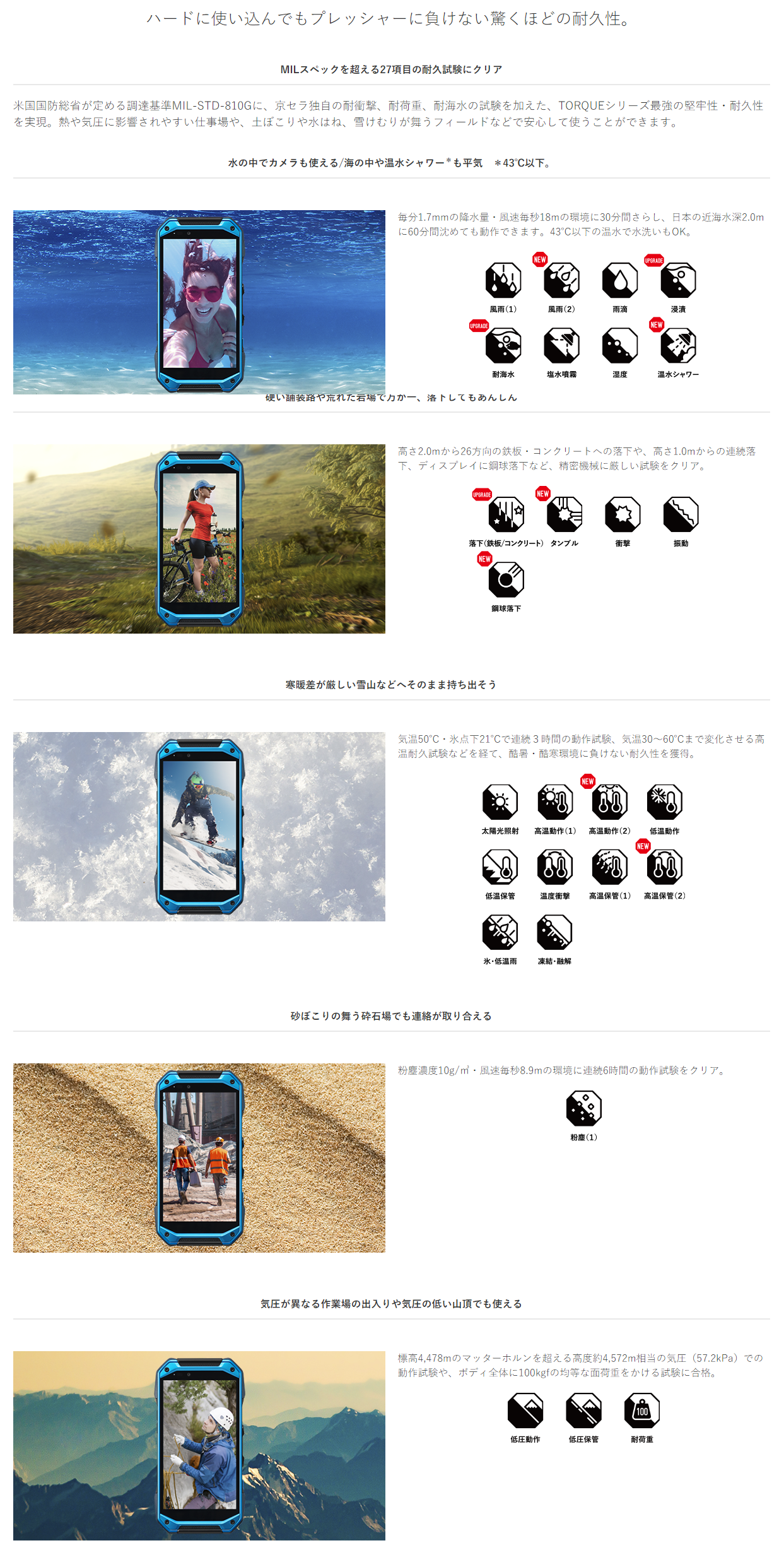 - その他:指紋リーダー、IP68の防塵防水、耐衝撃(2mの落下)、耐海水、ストラップホール、おサイフケータイ