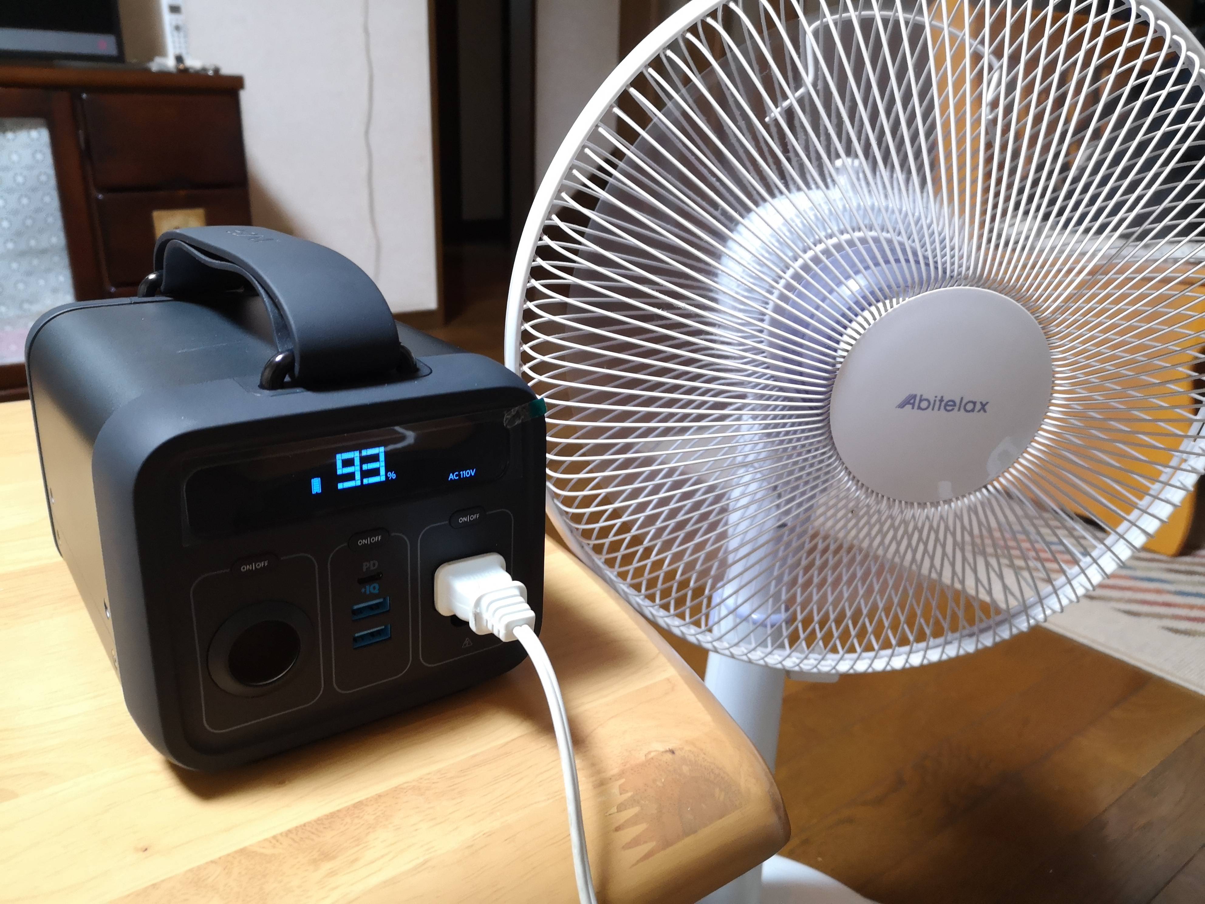 W数は機器ごとに書いてあるけど扇風機は強で50Wの消費電力だから213÷50で約4時間しか使えん