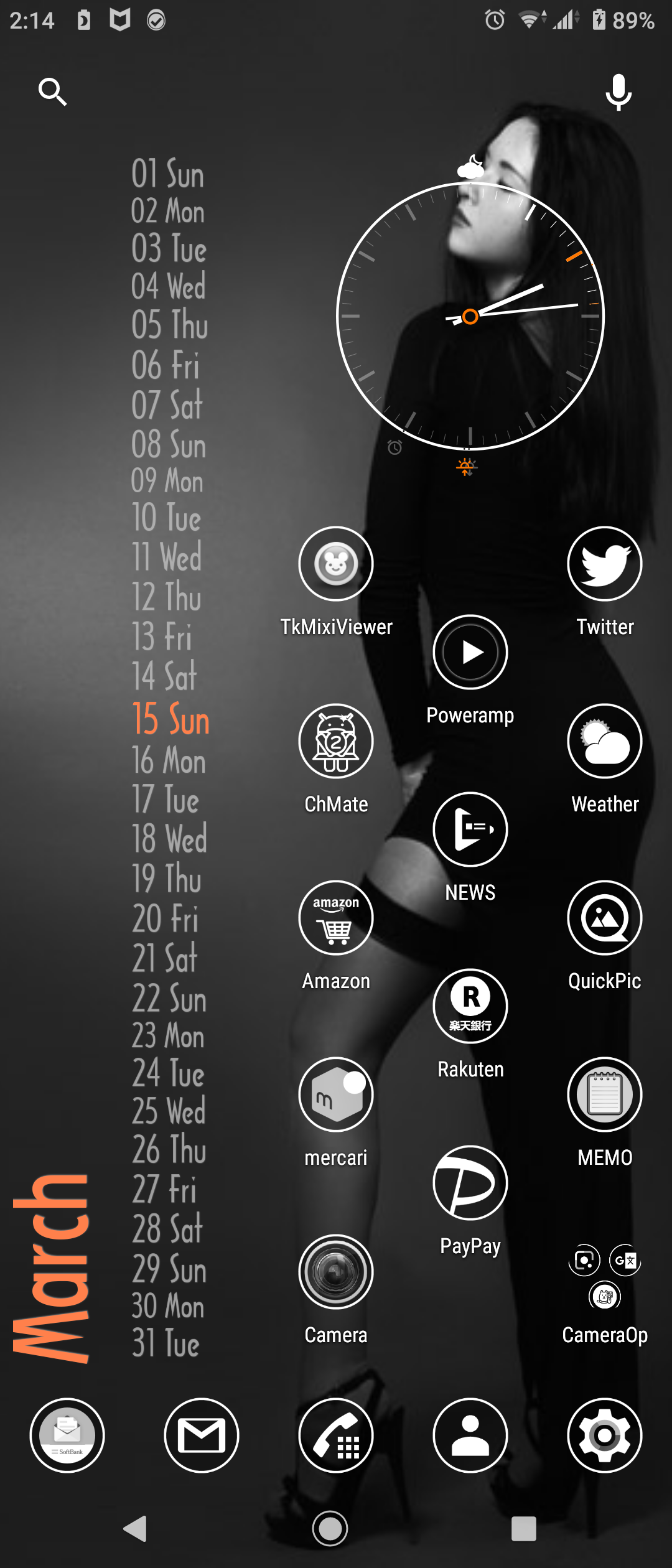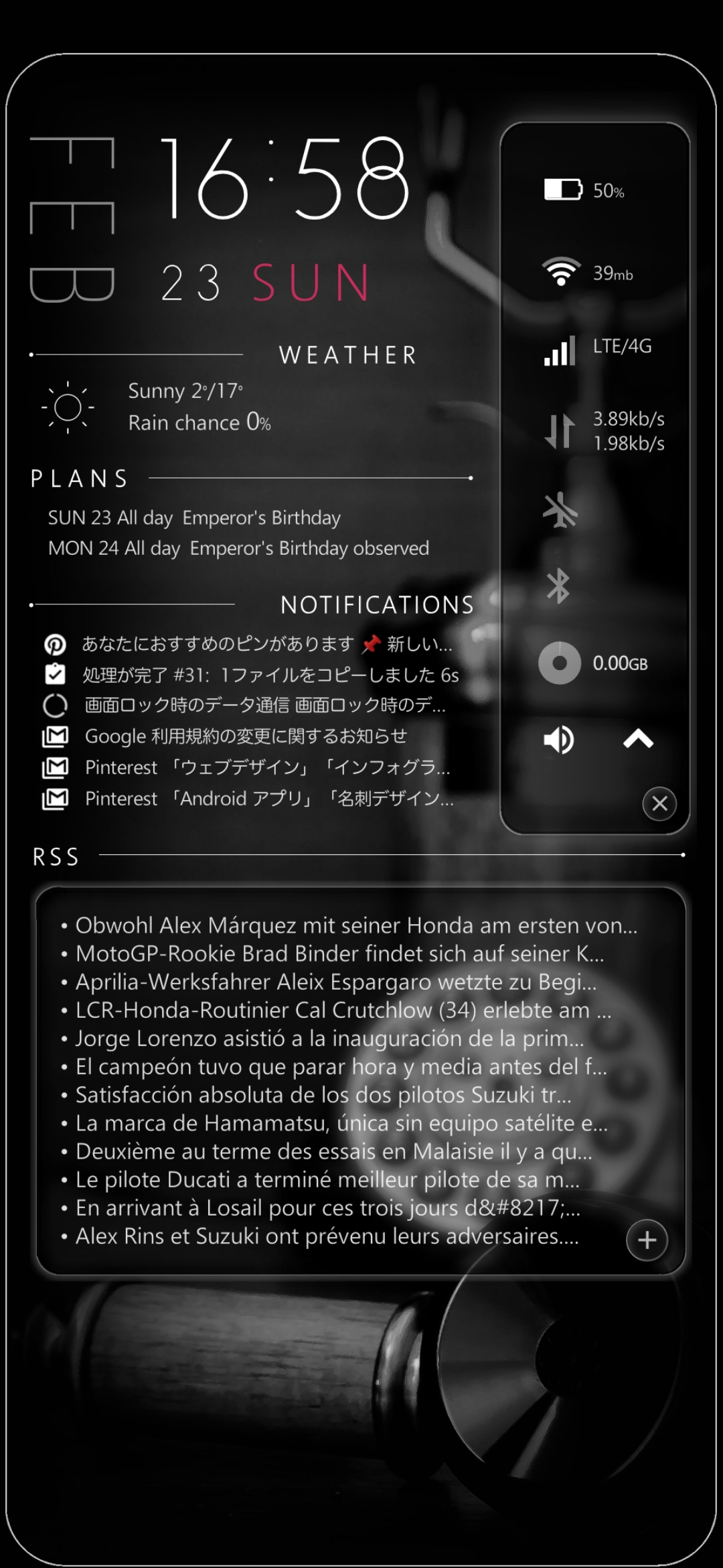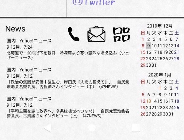ホームはKWGTのウィジェットでアプリランチャー、各種インフォメーション、RSSの表示の切り替えが出来るように、その他はHuaweiのEMUIのテーマ機能で作成