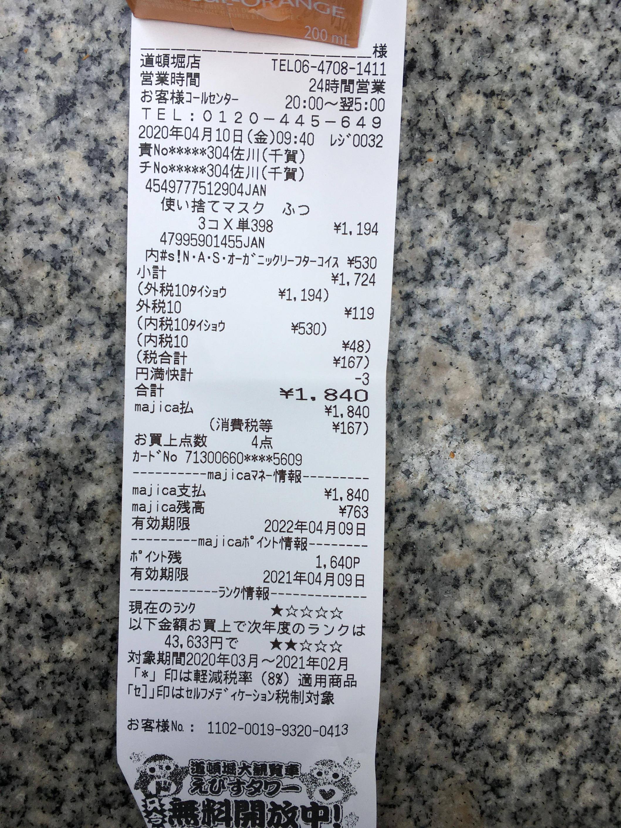 購入制限3袋までやったから、在庫余裕あるんかもせーへんから、マスク難民はドンキ覗いてみーや