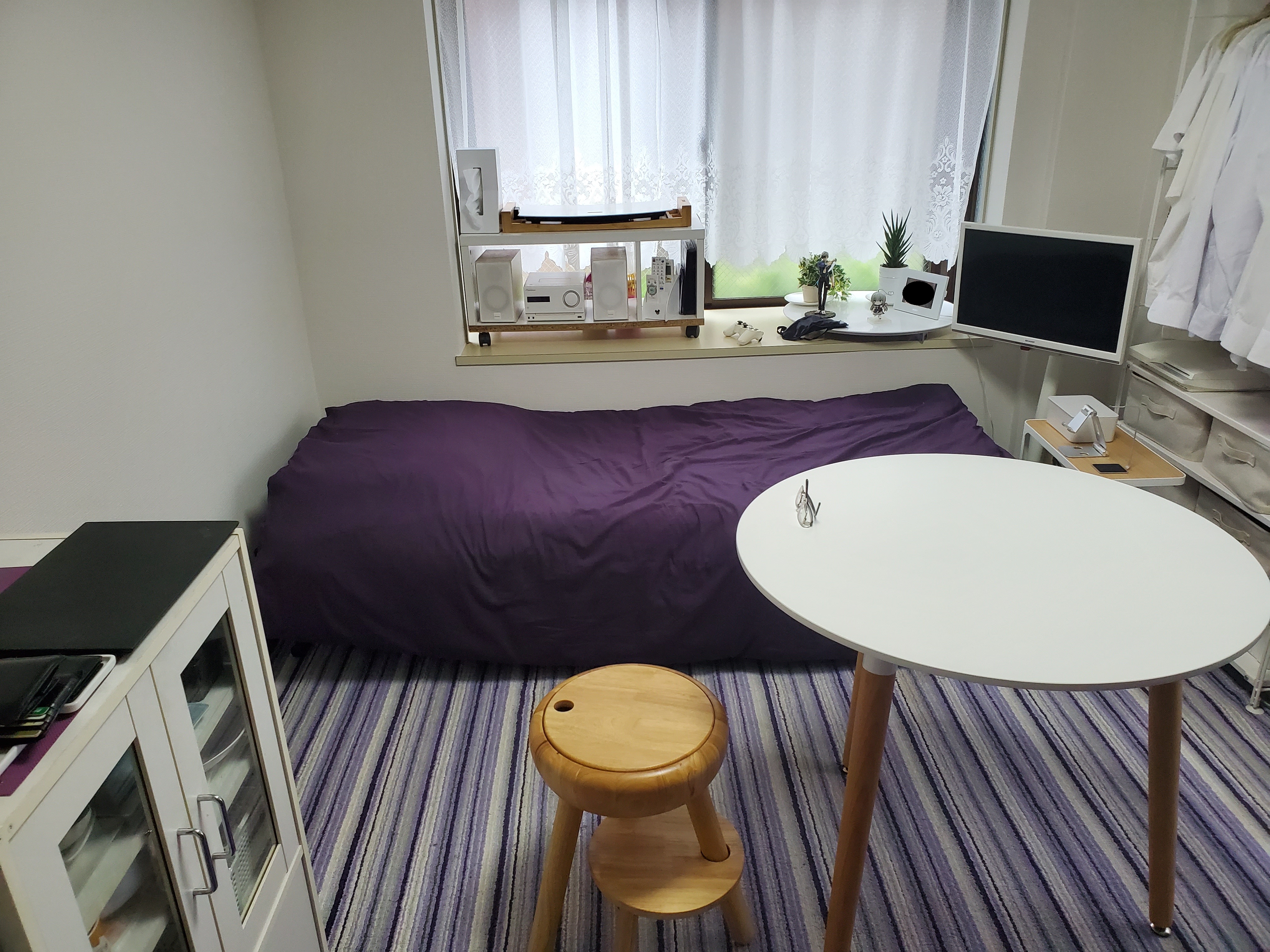 ホットプレートか、収納が少ないんだろけど調理家電が剥き出しでベットサイドにある違和感