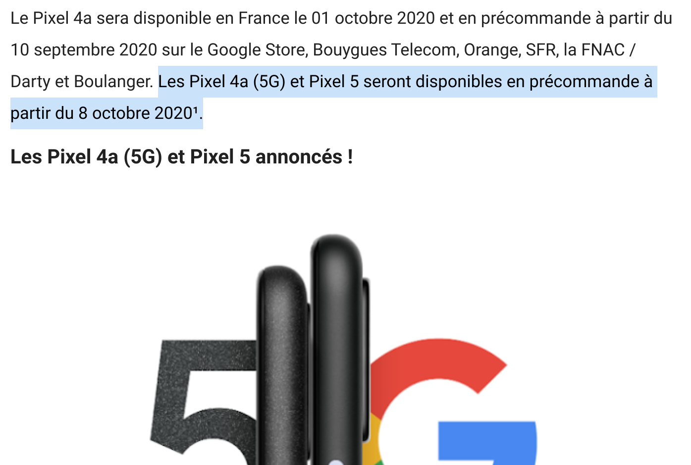 フランスの公式ブログに「The Pixel 4a (5G) and Pixel 5 will be available for pre-order from October 8, 2020¹」と書かれていたが削除された