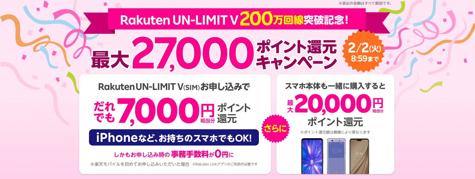Rakuten UN-LIMIT Vお申し込みキャンペーン 最大27,000円相当分をポイント還元