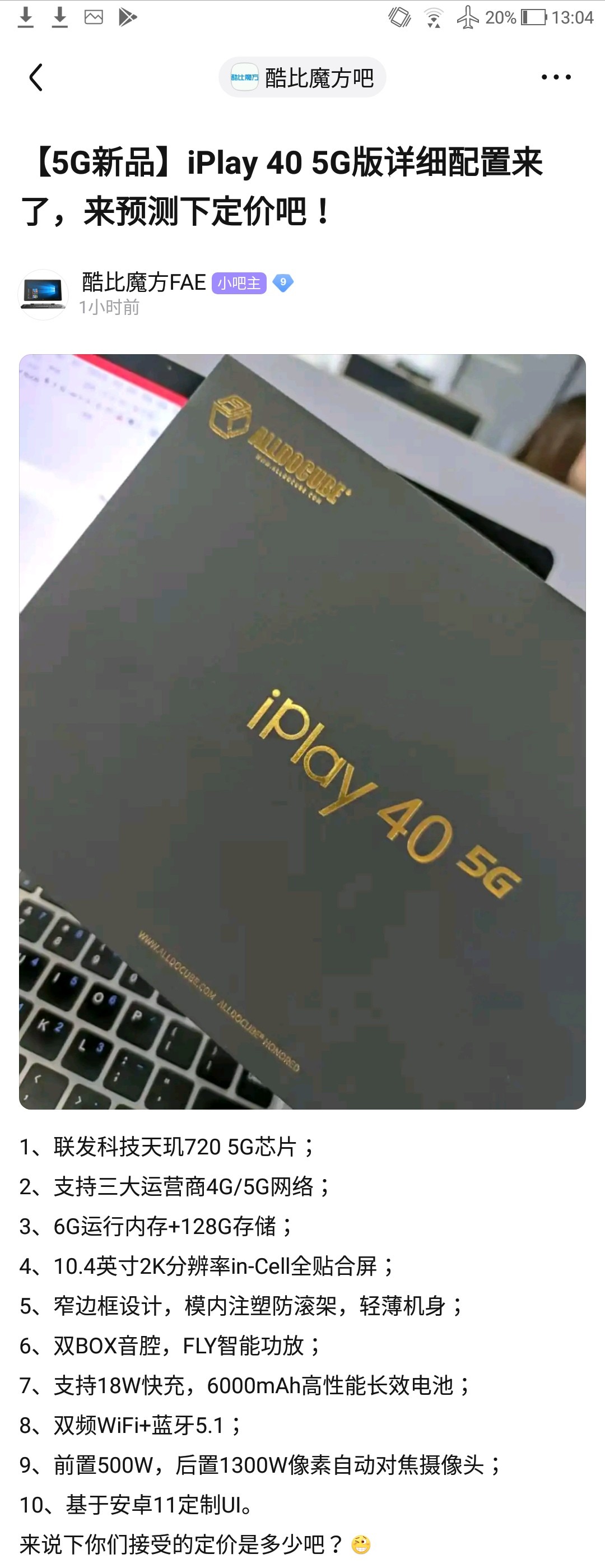 【5G新製品】iPlay405Gバージョンの詳細設定はこちらです。価格を予測しましょう!