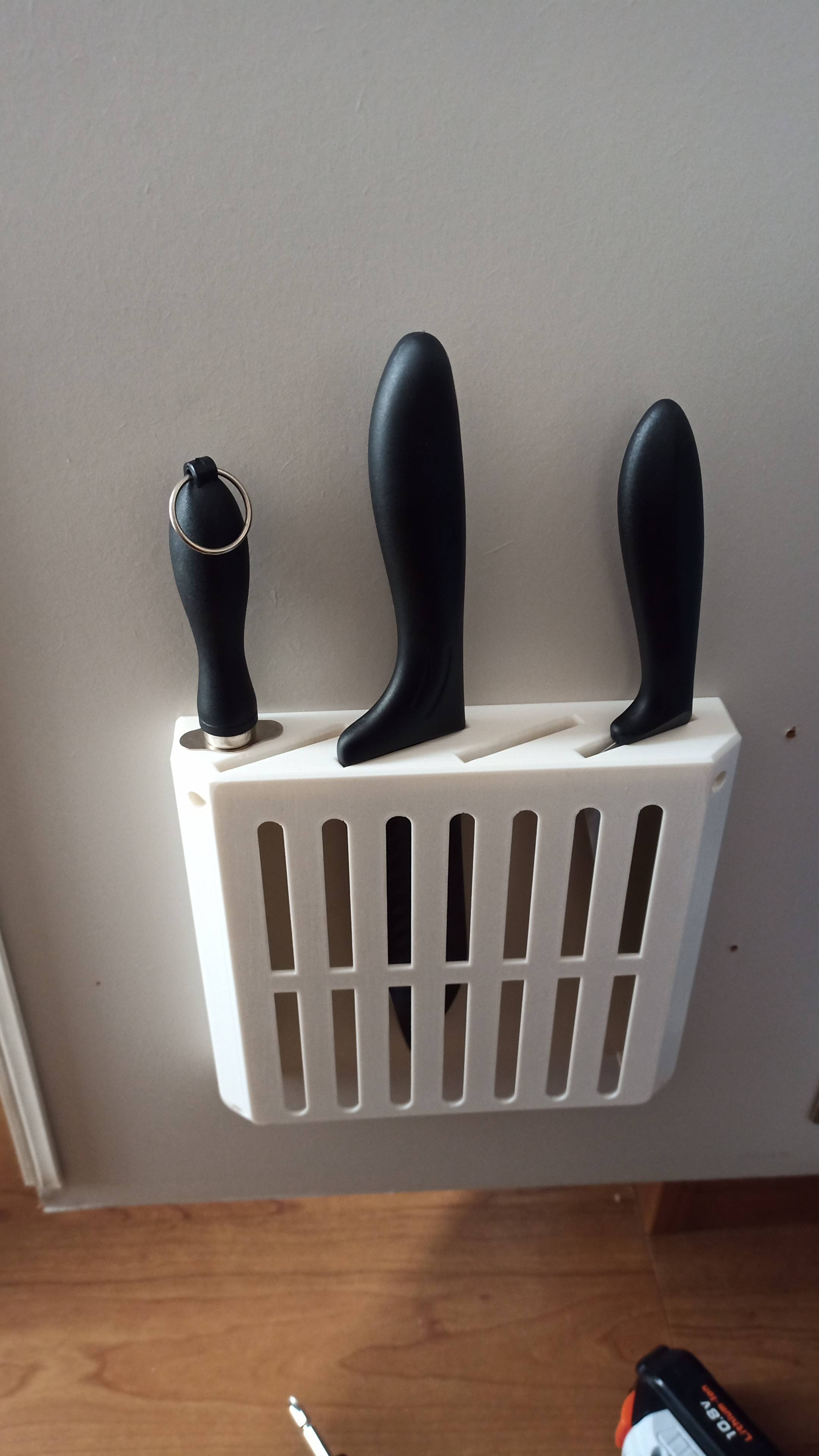 包丁サイズの穴とシャープナーの穴とビスの穴を開けてるだけ