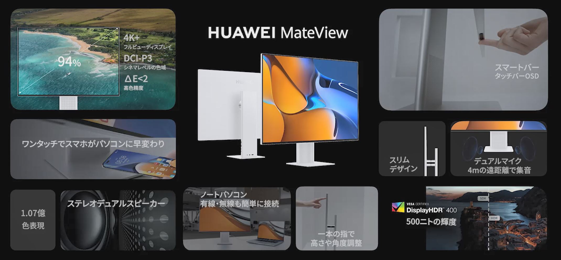 Huawei Japanは7月13日、モニター「Huawei Display」「MateView」「MateView GT」やHarmonyOS搭載タブレット「MatePad 11」、ノートPC「MateBook X Pro 2021」「MateBook D 15」、スマートウォッチ「Huawei WATCH 3」、完全ワイヤレスイヤホン「Freebuds 4」、スピーカー搭載スマートグラス「HUAWEI×GENTLE MONSTER Eyewear Ⅱ」を日本で発表しました。7月13日より順次発売。