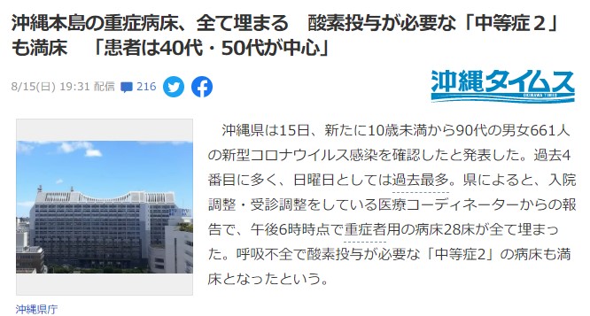 沖縄本島の重症病床、全て埋まる 酸素投与が必要な「中等症2」も満床 「患者は40代・50代が中心」