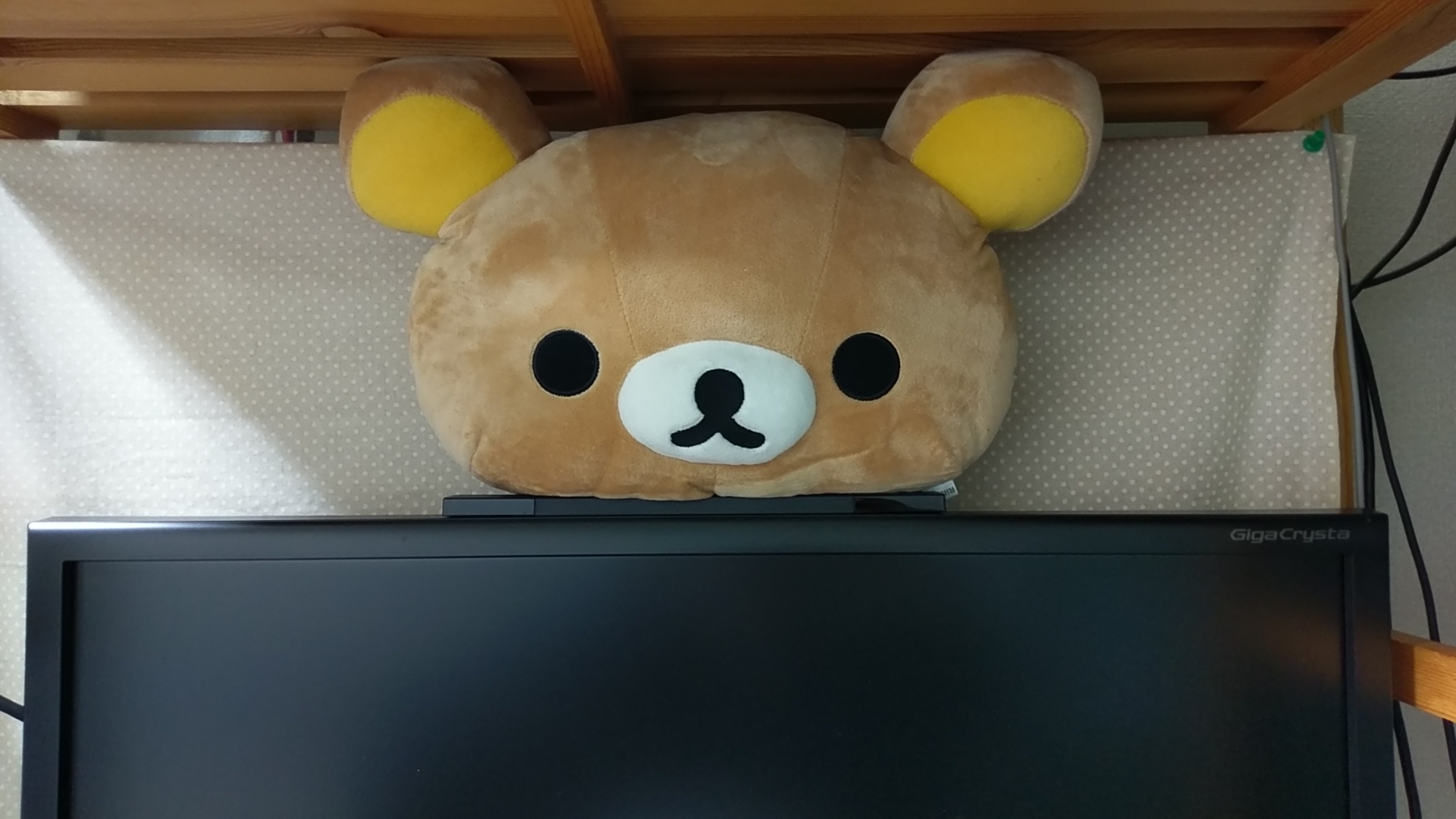 リラックマの顔だけのクッションをモニターの上に乗っけてる