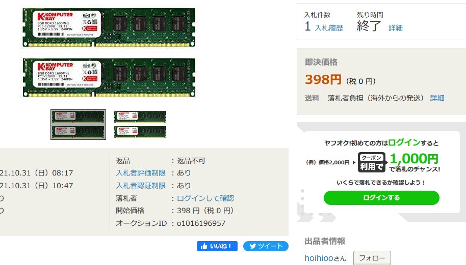 DDR3のメモリーが400円で売ってて酔った勢いで落札してたらしい