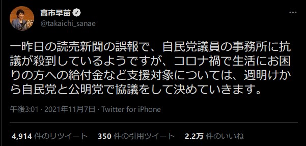 一昨日の読売新聞の誤報で、自民党議員の事務所に抗議が殺到しているようですが、コロナ禍で生活にお困りの方への給付金など支援対象については、週明けから自民党と公明党で協議をして決めていきます。