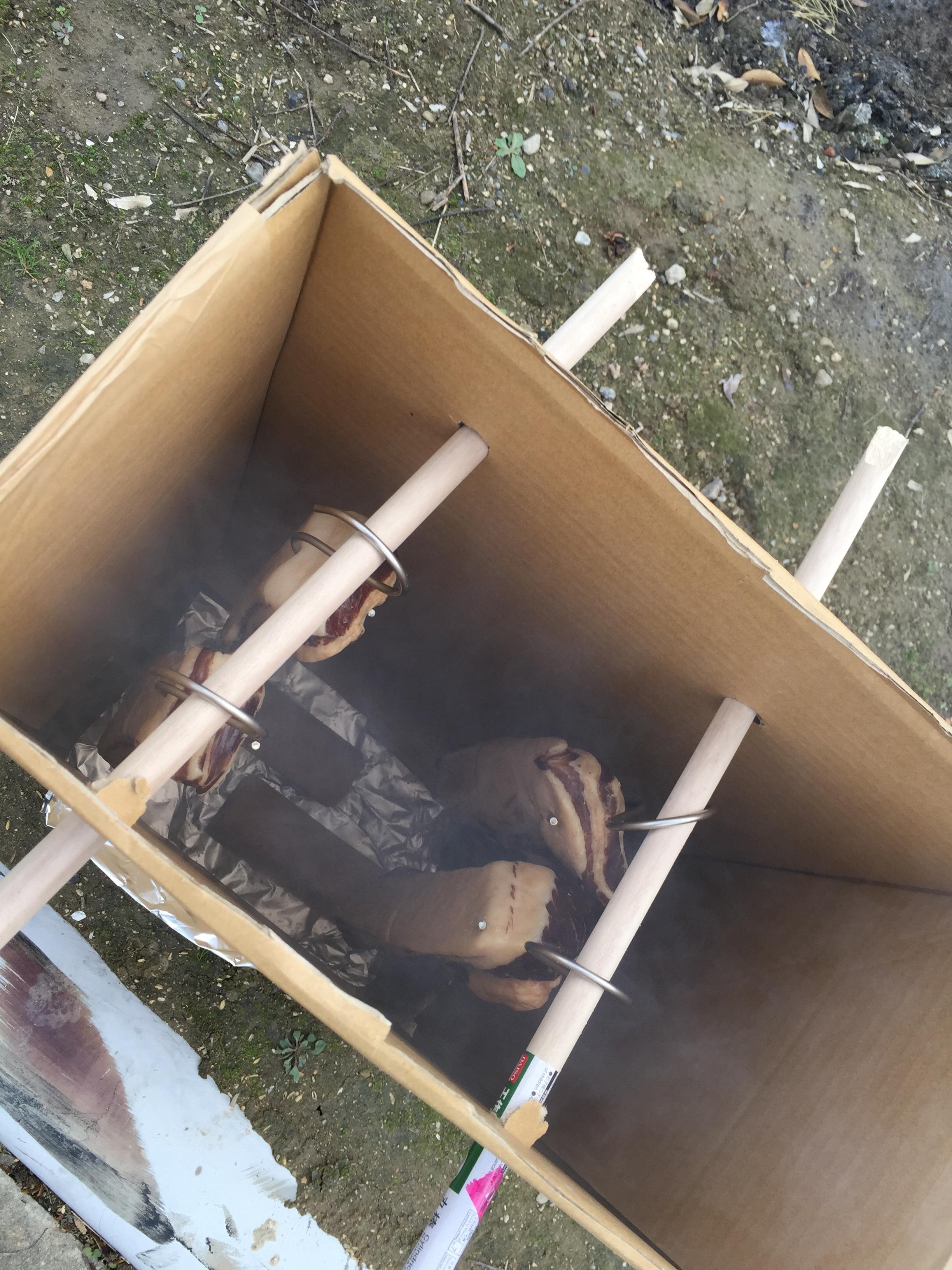 たまにベーコンまとめて作るけど使い終わった段ボール燻製器はそのまま燃やしてる